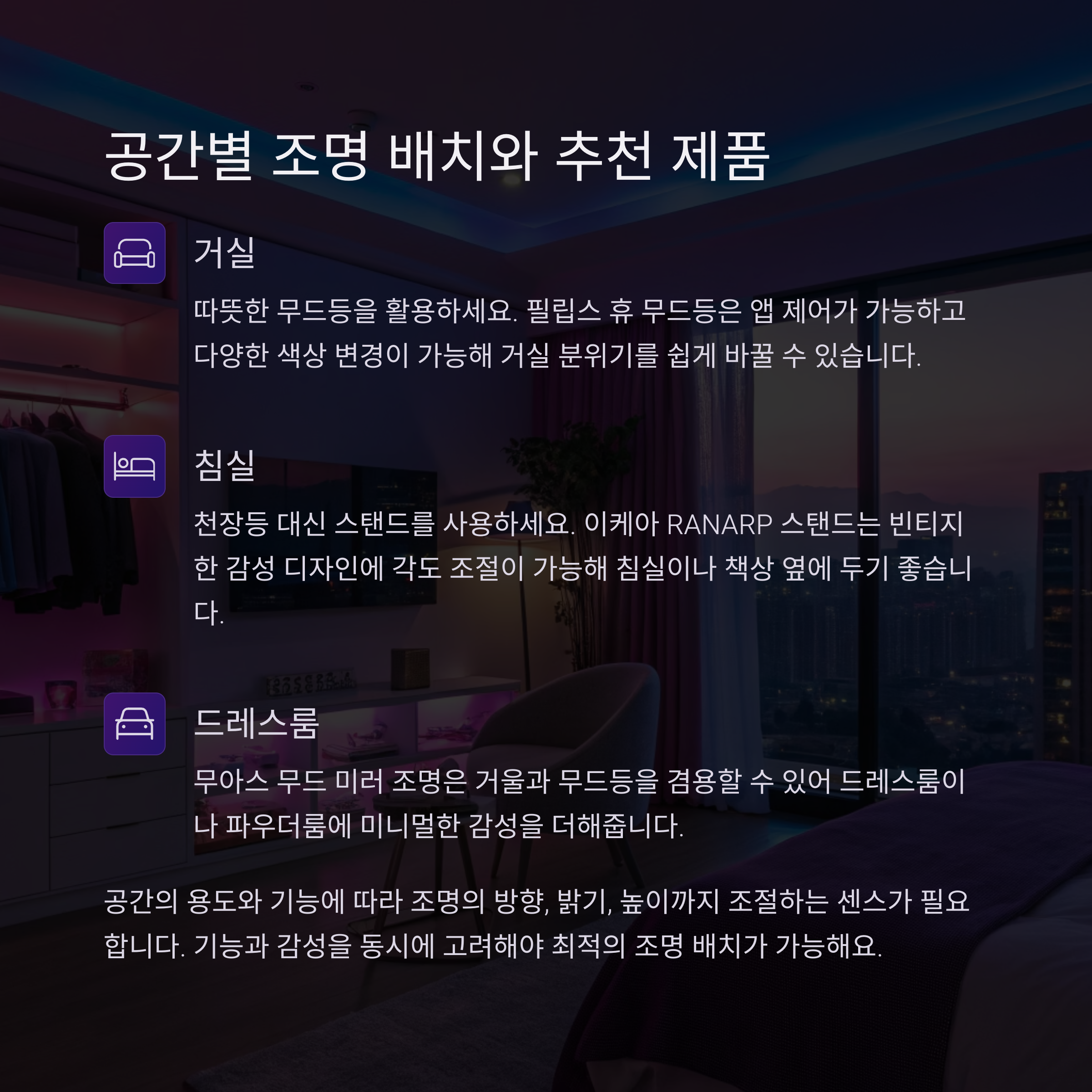 | 필립스 휴 무드등 | 앱 제어 가능, 다양한 색상 변경 | 거실, 침대 머리맡 |