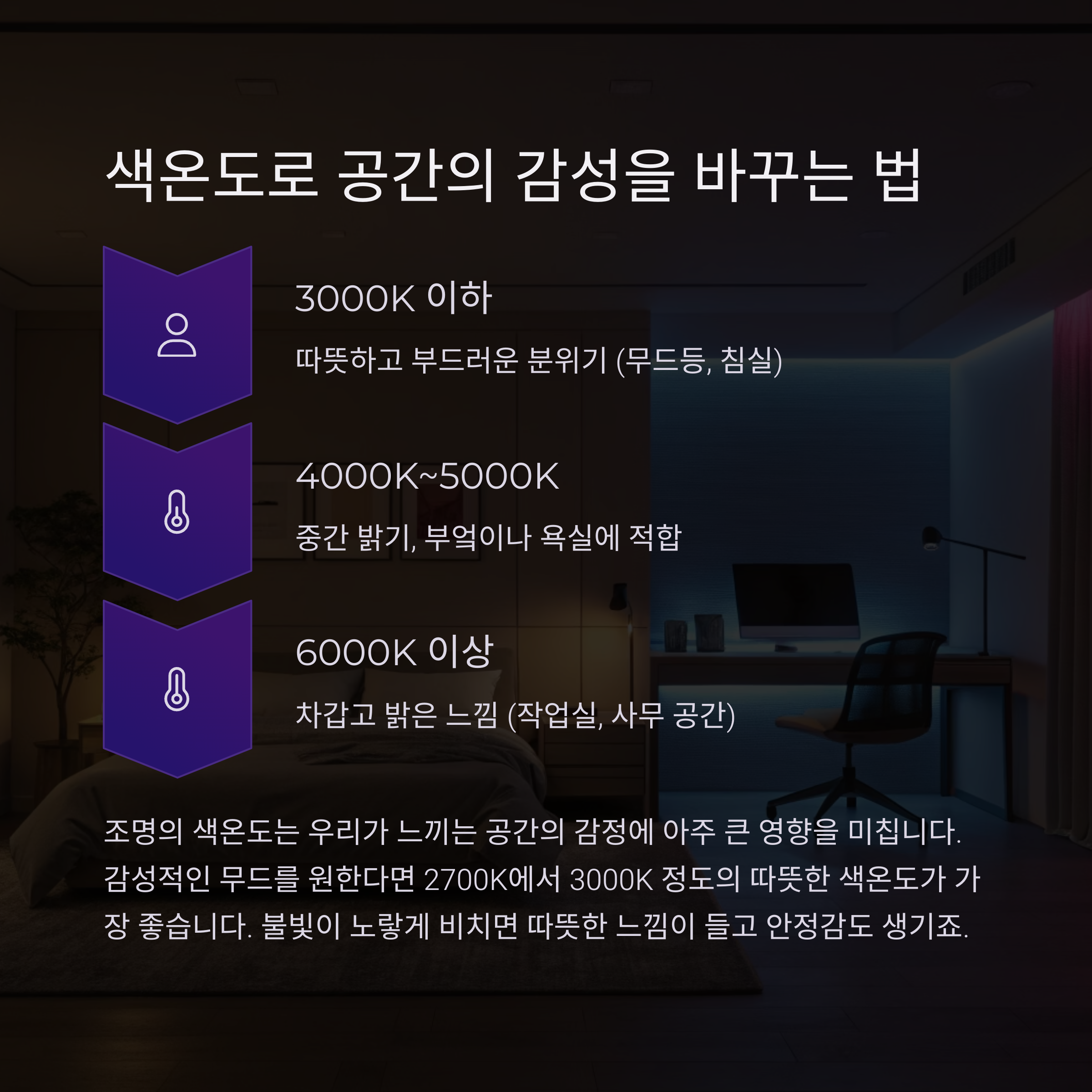 - 6000K 이상: 차갑고 밝은 느낌 (작업실, 사무 공간)