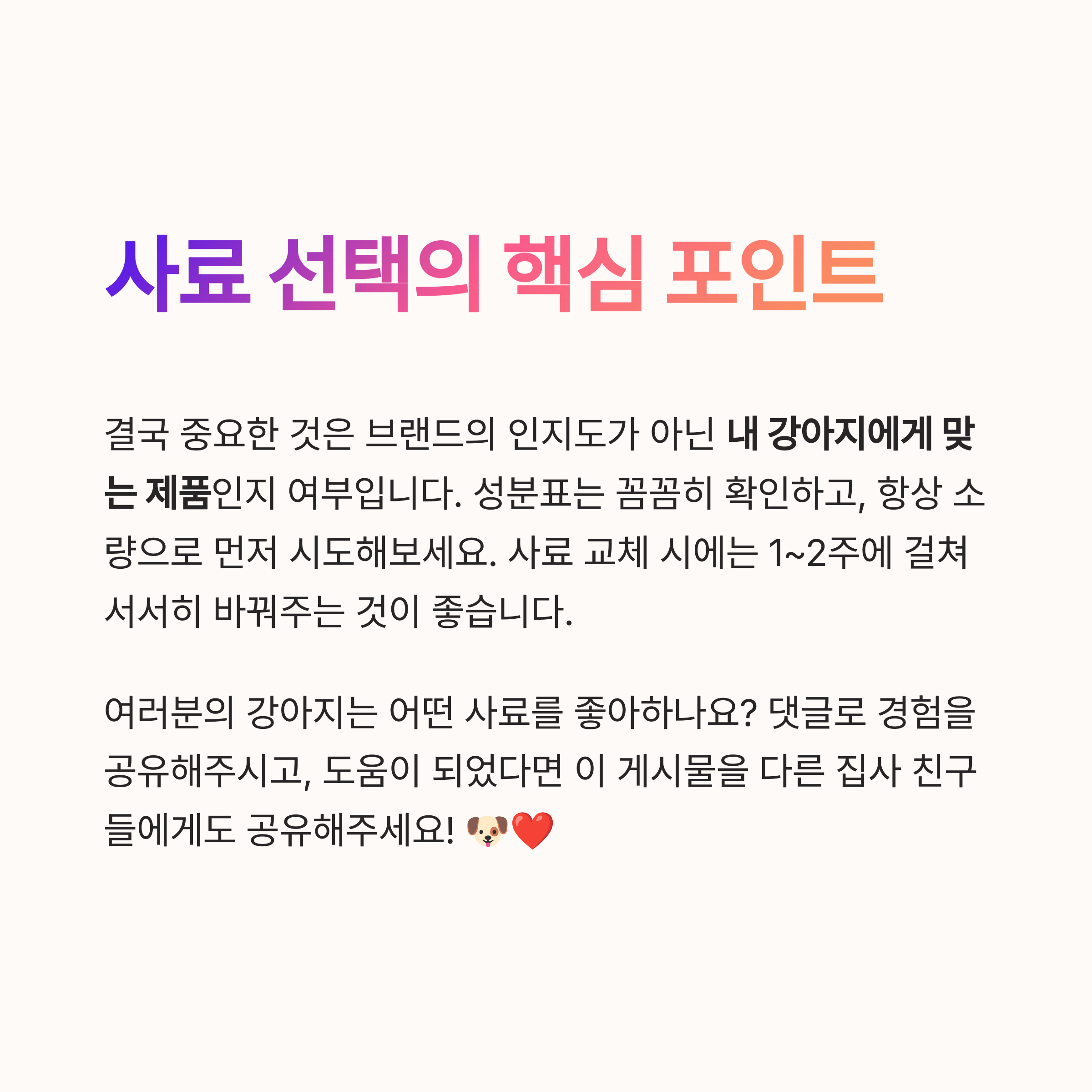 강아지 사료는 단순한 먹거리가 아니라, 아이의 건강과 직결되는 중요한 선택이에요. 우리 아이의 몸에 맞는 사료를 찾는 건 시간이 걸릴 수도 있지만, 그만큼 가치 있는 과정이기도 하죠. 오늘 공유한 정보들이 사료 선택의 기준이 되어주길 바라며, 여러분의 반려견이 더 건강하고 행복한 하루하루를 보내길 진심으로 응원할게요! 다음에는 고양이 사료 편으로 찾아올게요 :)