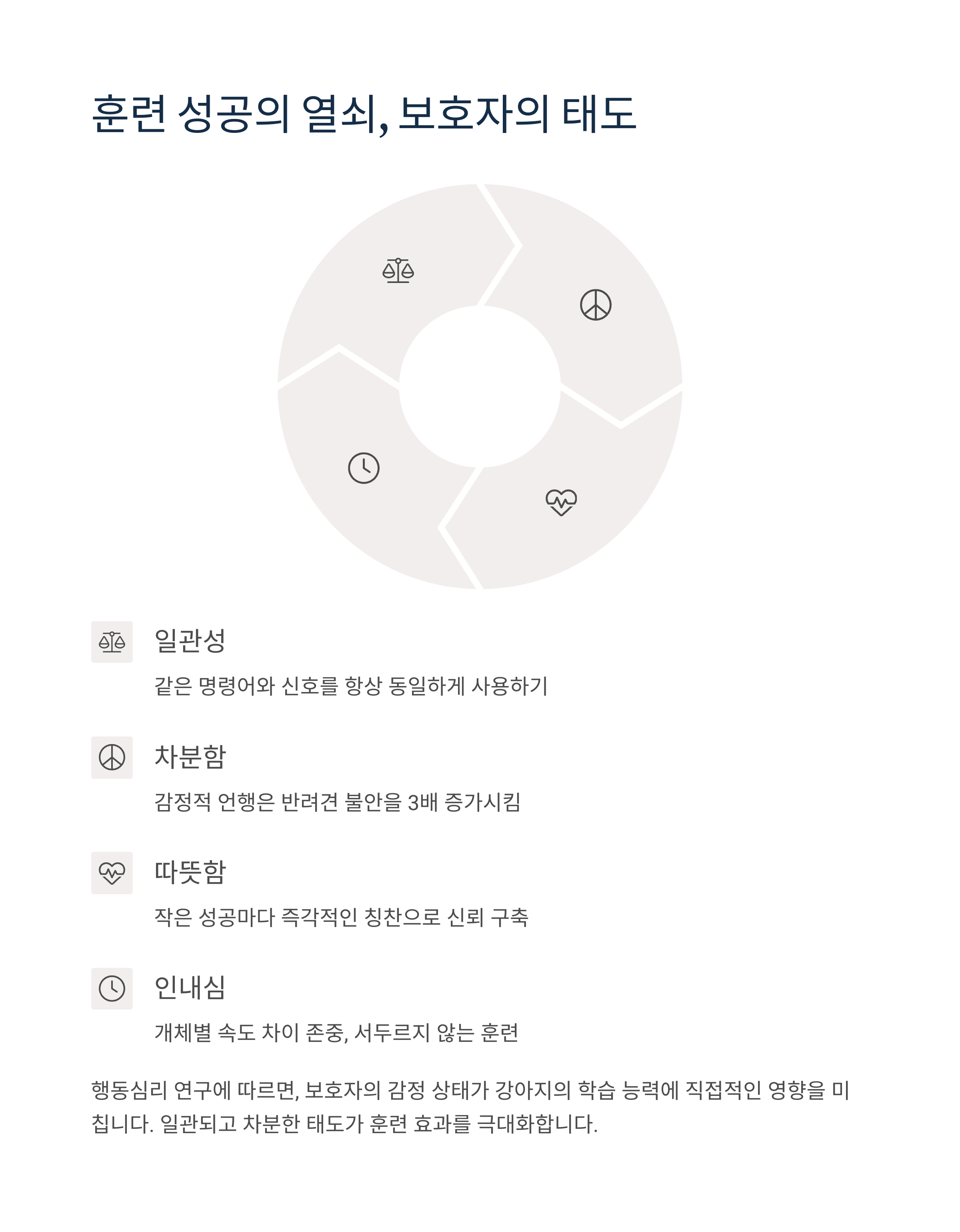 솔직히 말하면, 훈련의 90%는 보호자에게 달려있어요. 아무리 좋은 도구나 방법이 있어도, 보호자가 일관성 없거나 감정적으로 대하면 강아지는 혼란스러워하죠. 다음 항목들을 기억해두세요.