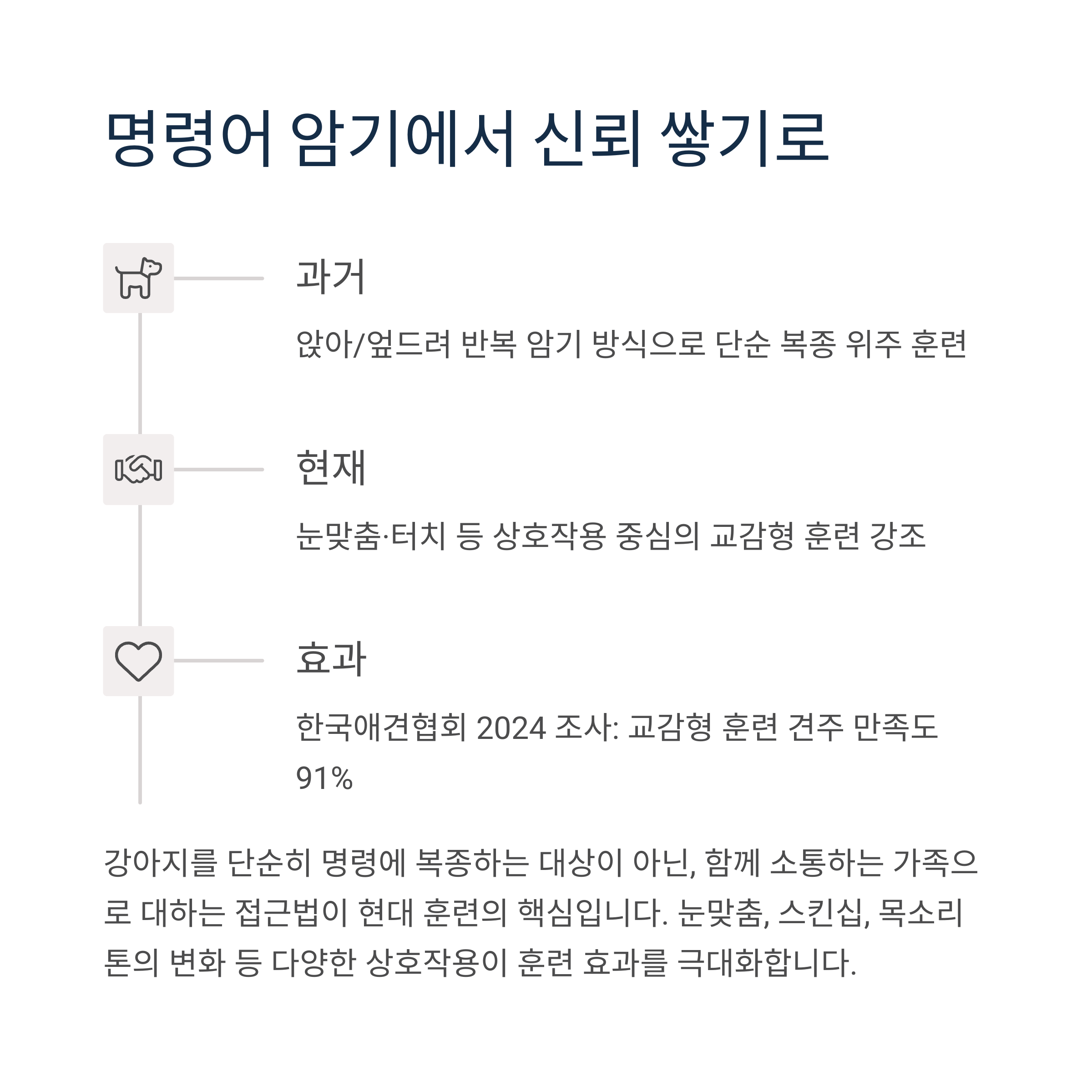 반려견 훈련에도 시대 변화가 뚜렷하게 보입니다. 예전엔 위계질서 중심의 훈련이 많았지만, 지금은 파트너십을 기반으로 한 방식이 대세입니다. 단순히 명령을 따르게 하는 게 아니라, 감정을 읽고, 스스로 결정할 수 있도록 유도하는 것이죠.