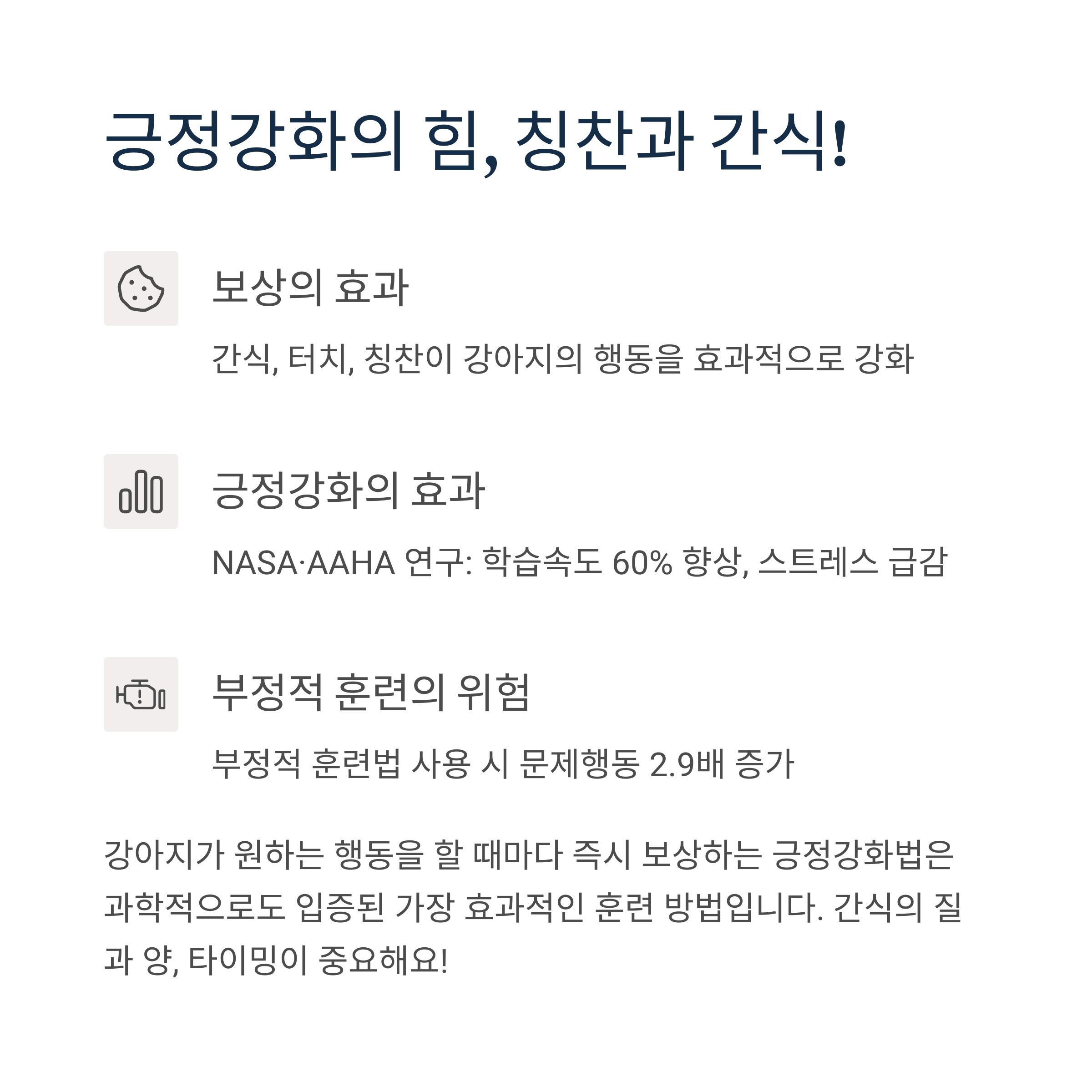 | 보상 방식 | 간식보다 벌 중심 | 긍정 보상 중심 |