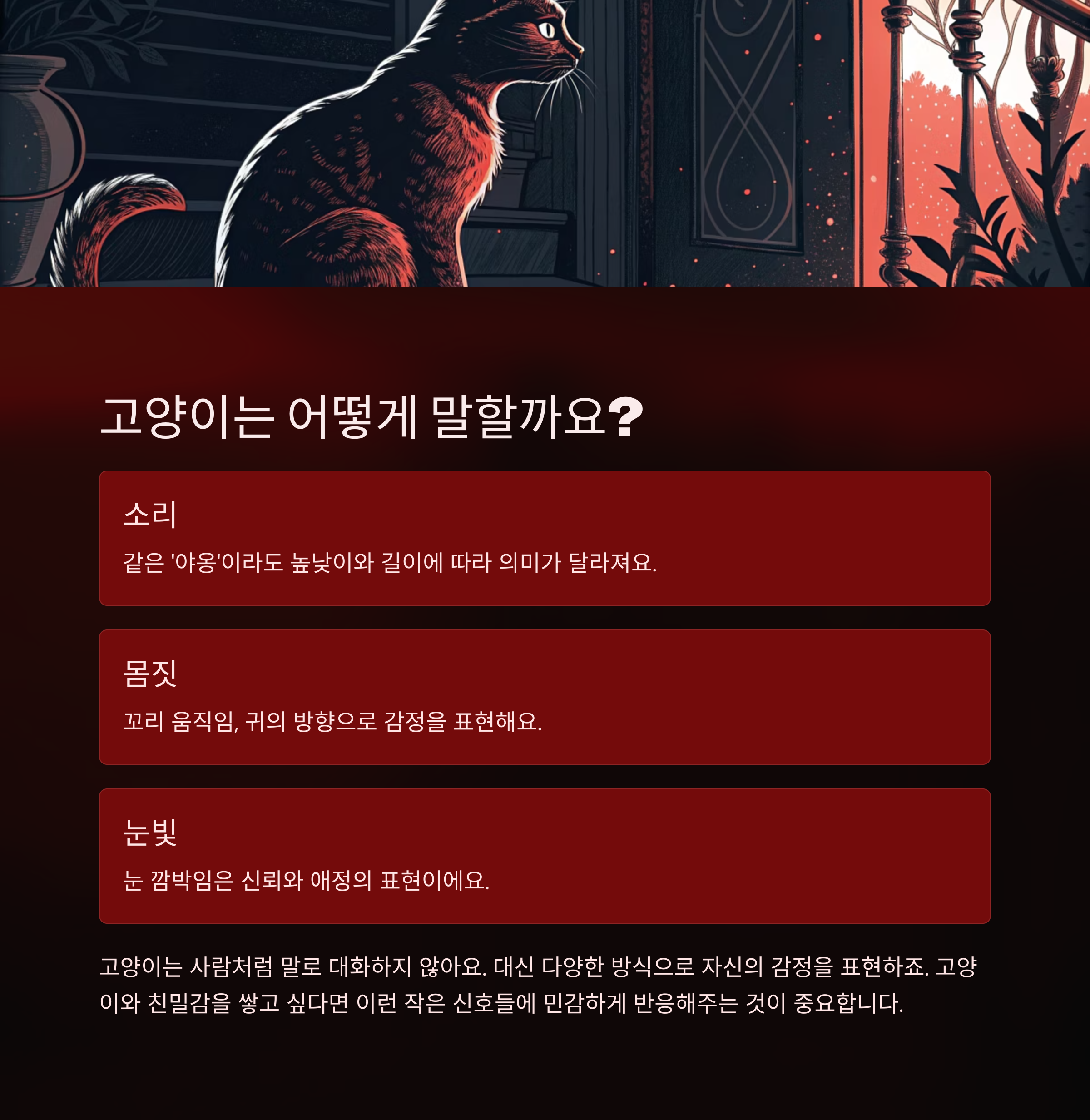 고양이들은 사람처럼 말로 대화하지 않아요. 대신 소리, 몸짓, 눈빛으로 자신의 감정을 표현하죠. 예를 들어 '야옹' 소리는 사람과 소통할 때 주로 사용하는데, 같은 '야옹'이라도 높낮이나 길이에 따라 의미가 달라져요. 또한 꼬리의 움직임, 귀의 방향, 눈 깜박임도 중요한 소통 수단이에요. 고양이와 친밀감을 쌓고 싶다면 이런 작은 신호들에 민감하게 반응해주는 것이 중요하답니다.