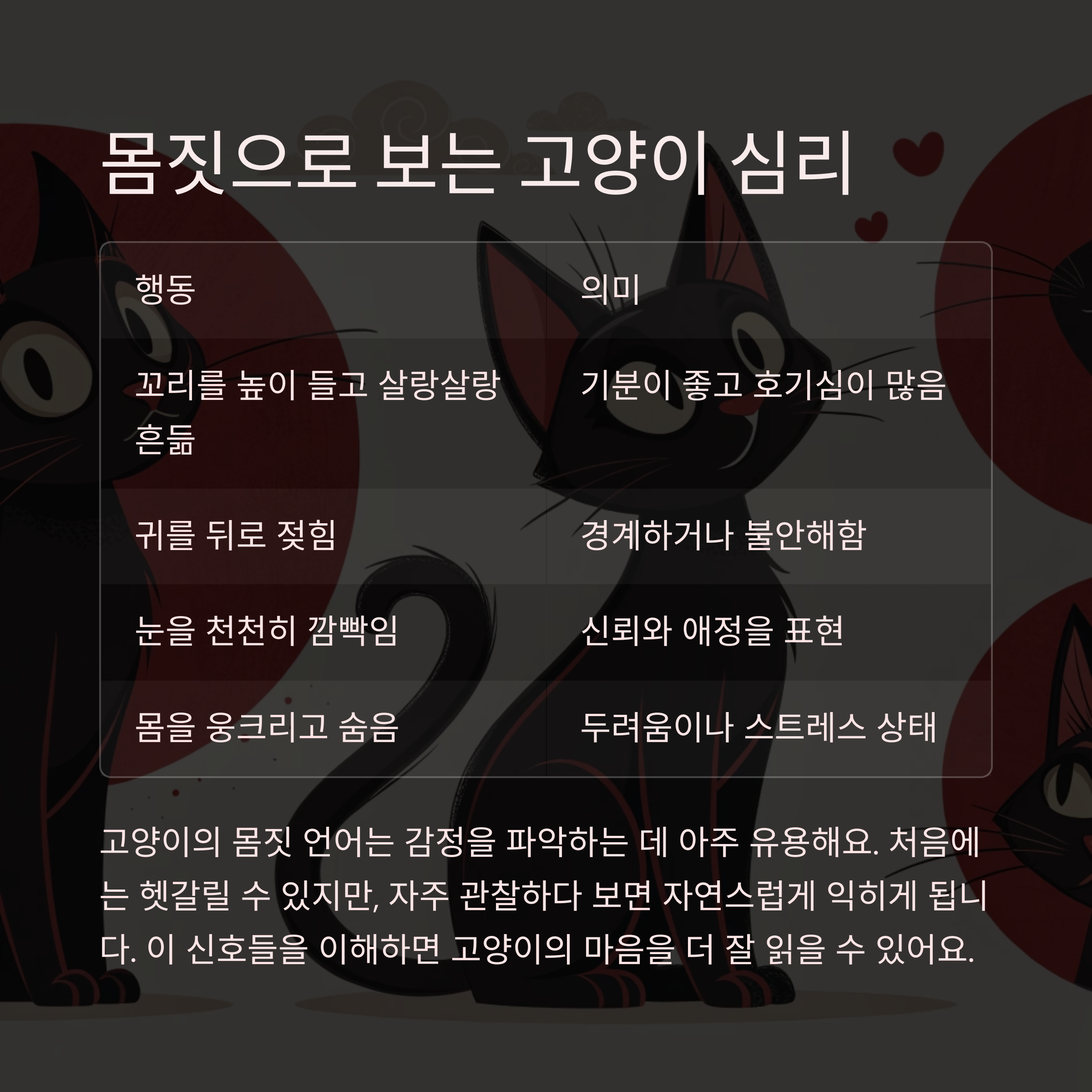 고양이의 몸짓 언어는 감정을 파악하는 데 아주 유용해요. 처음에는 헷갈릴 수 있지만, 자주 관찰하다 보면 자연스럽게 익히게 되더라고요. 아래 테이블을 참고해보세요!