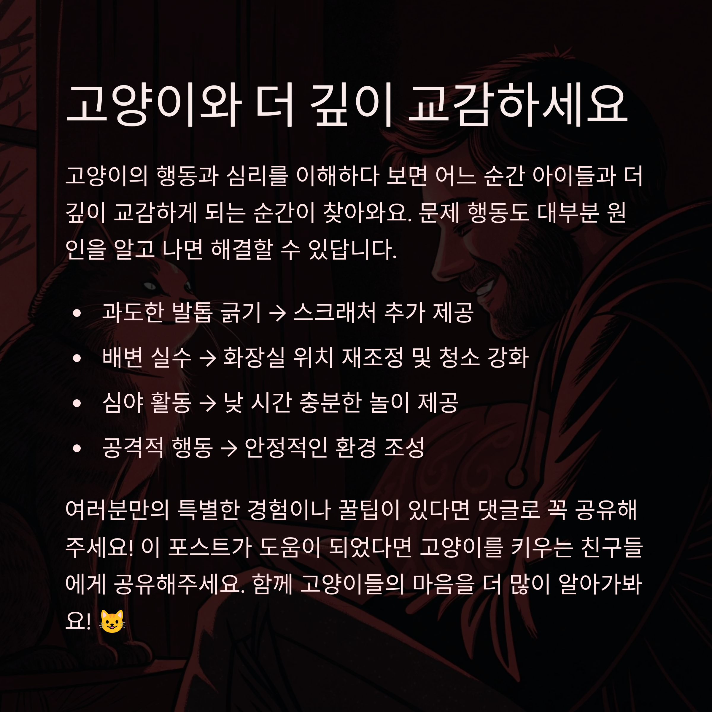 고양이들의 행동과 심리를 이해하다 보면 어느 순간 아이들과 더 깊이 교감하게 되는 순간이 찾아와요. 오늘 소개한 내용들이 여러분의 고양이 라이프에 작은 도움이 되길 바라요. 혹시 여러분만의 특별한 경험이나 꿀팁이 있다면 댓글로 꼭 공유해 주세요! 저도 다른 분들의 이야기를 듣는 걸 정말 좋아하거든요. 앞으로도 함께 고양이들의 마음을 더 많이 알아가봐요 :)