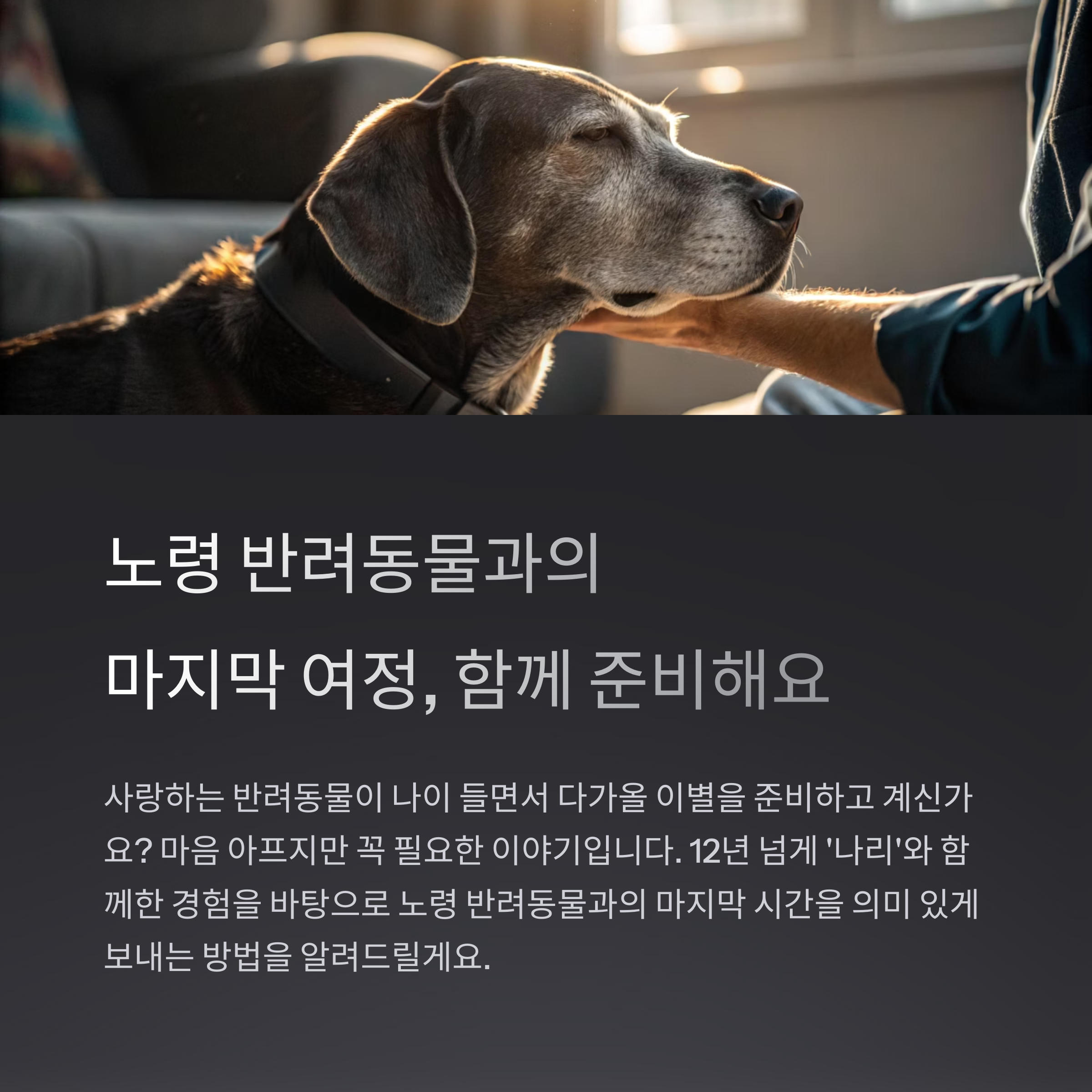 노령 반려동물과의 여정은 우리에게도 많은 것을 가르쳐주는 시간이에요. 그만큼 더 깊은 사랑과 이해로 채워지길 응원합니다.
