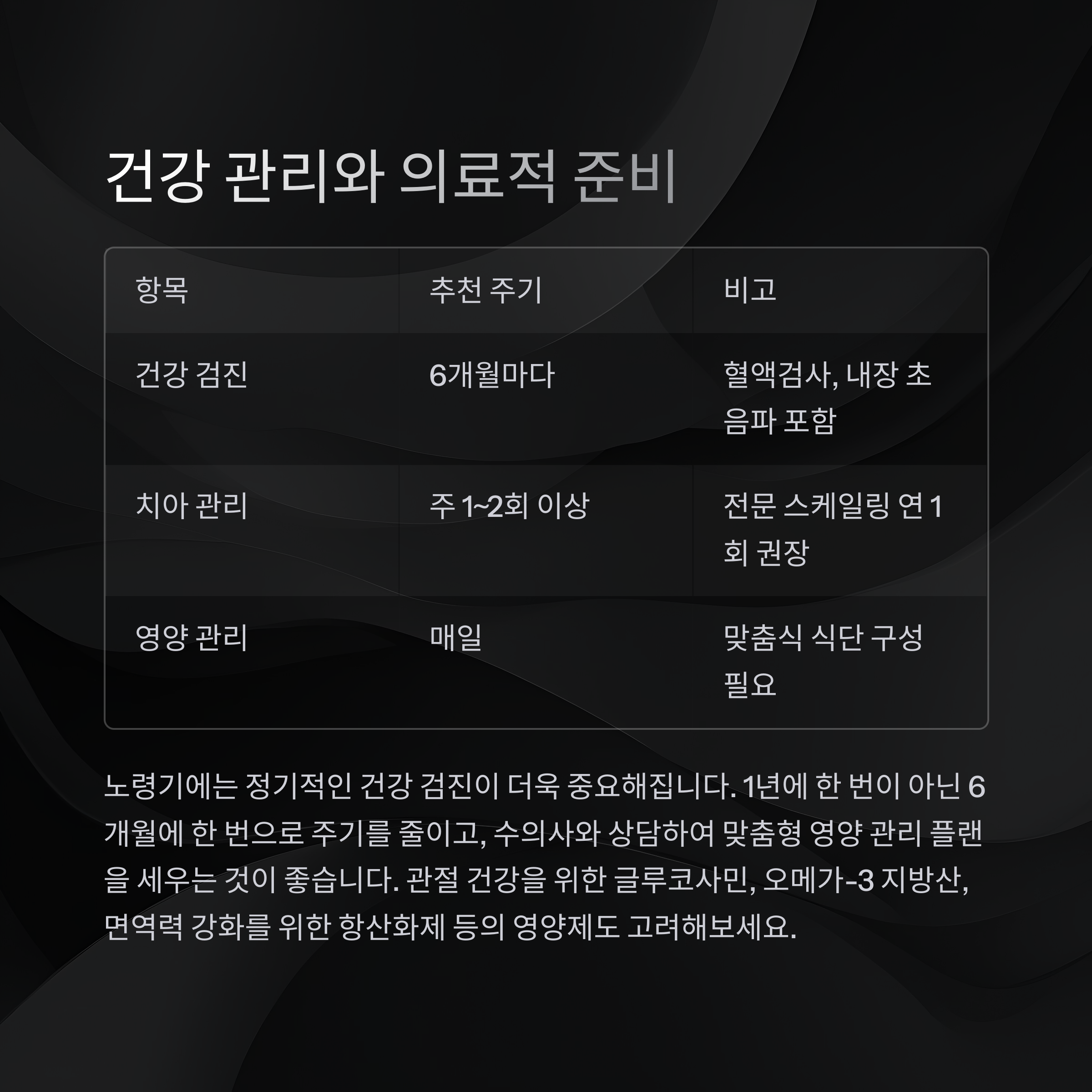 | 건강 검진 | 6개월마다 | 혈액검사, 내장 초음파 포함 |