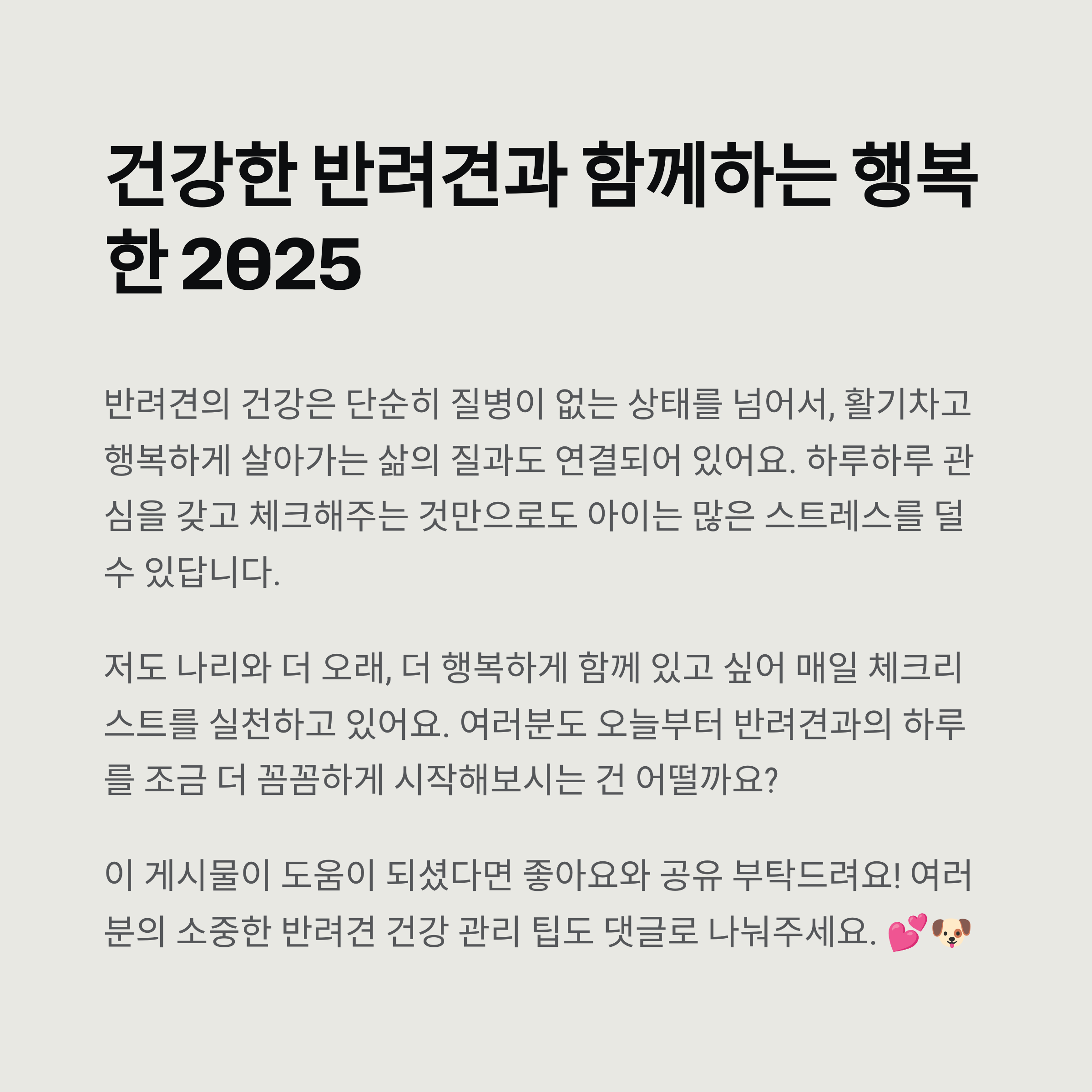 반려견의 건강은 단순히 질병이 없는 상태를 넘어서, 활기차고 행복하게 살아가는 삶의 질과도 연결되어 있어요. 하루하루 관심을 갖고 체크해주는 것만으로도 아이는 많은 스트레스를 덜 수 있답니다. 저도 나리와 더 오래, 더 행복하게 함께 있고 싶어 매일 체크리스트를 실천하고 있어요. 여러분도 오늘부터 반려견과의 하루를 조금 더 꼼꼼하게 시작해보시는 건 어떨까요? 혹시 놓치고 있던 신호가 있다면, 지금이 바로 점검의 타이밍이에요!