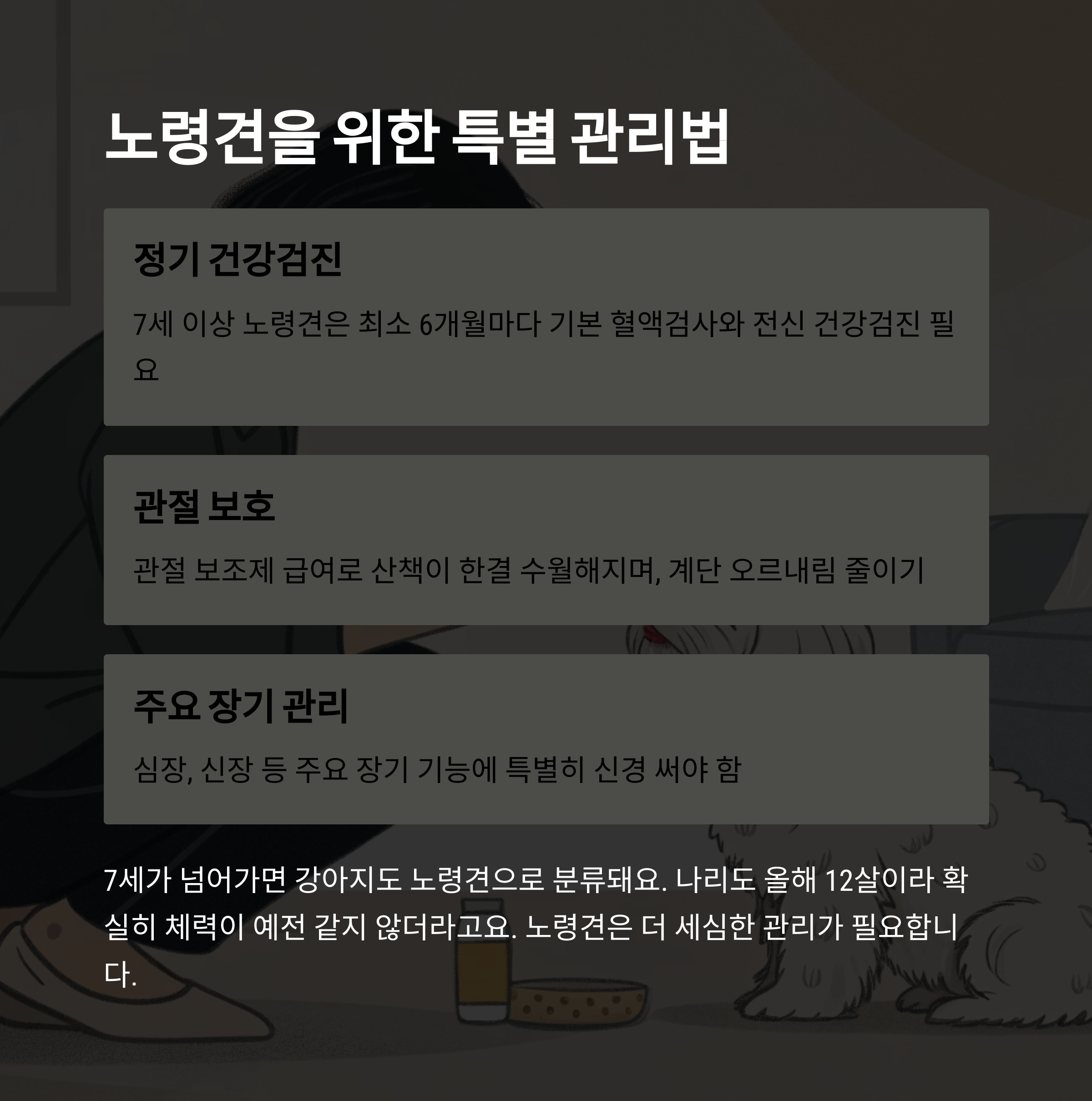 7세가 넘어가면 강아지도 노령견으로 분류돼요. 나리도 올해 12살이라 확실히 체력이 예전 같지 않더라고요. 노령견은 정기적인 건강검진 외에도 관절 보호와 심장, 신장 등 주요 장기 기능에 신경 써야 해요. 특히 관절 보조제를 먹이기 시작한 뒤로 한결 산책이 수월해졌다는 느낌이 들었어요.