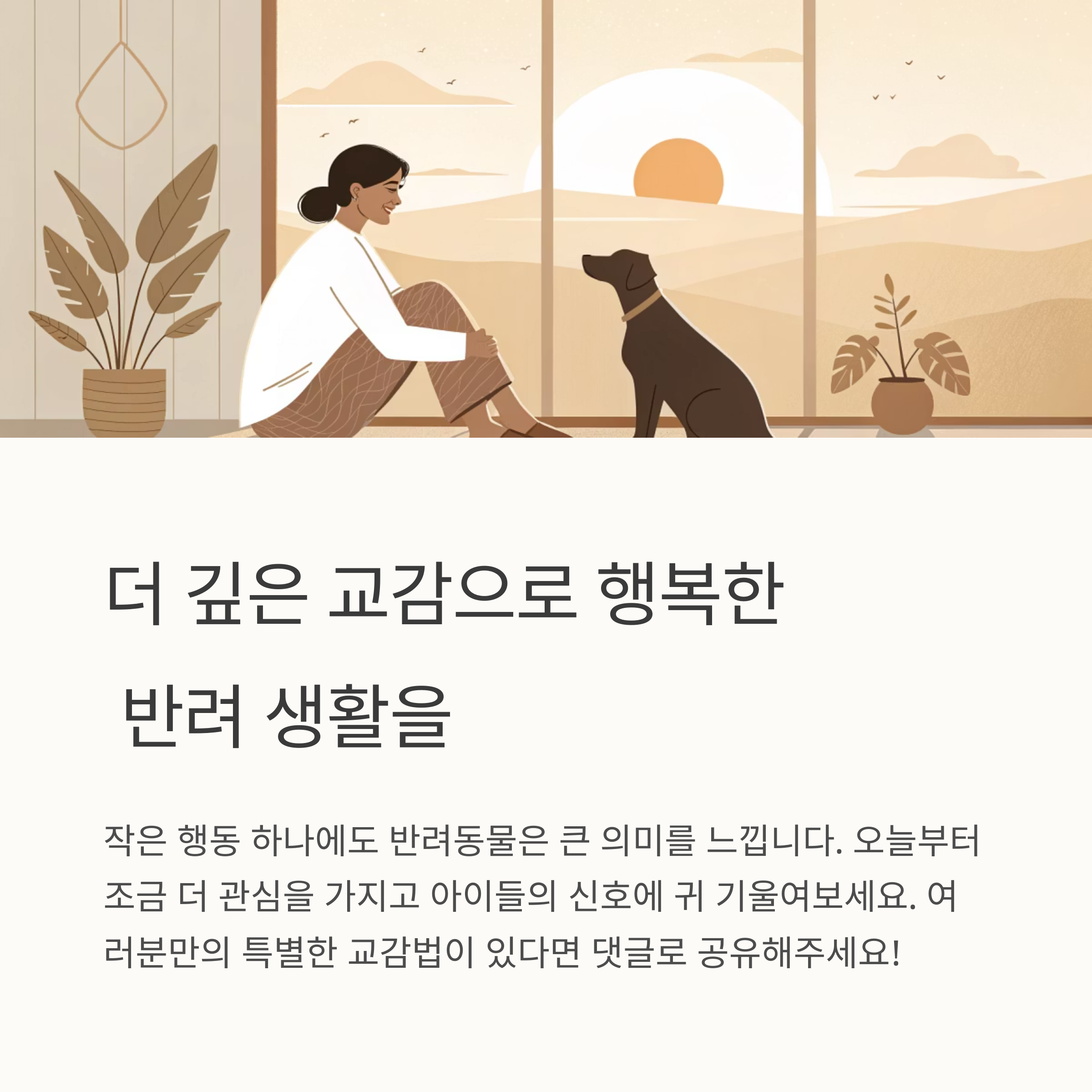 오늘 저와 함께 반려동물과의 교감법을 깊이 알아보셨는데 어떠셨나요? 작은 행동 하나에도 반려동물은 큰 의미를 느끼고 있다는 걸 다시금 느끼게 돼요. 우리 아이들과 더 좋은 관계를 만들기 위해 조금만 더 관심을 가져보는 건 어떨까요? 여러분의 경험이나 궁금한 점이 있다면 댓글로 꼭 남겨주세요. 서로의 이야기를 나누며 함께 더 행복한 반려 생활을 만들어가요!
