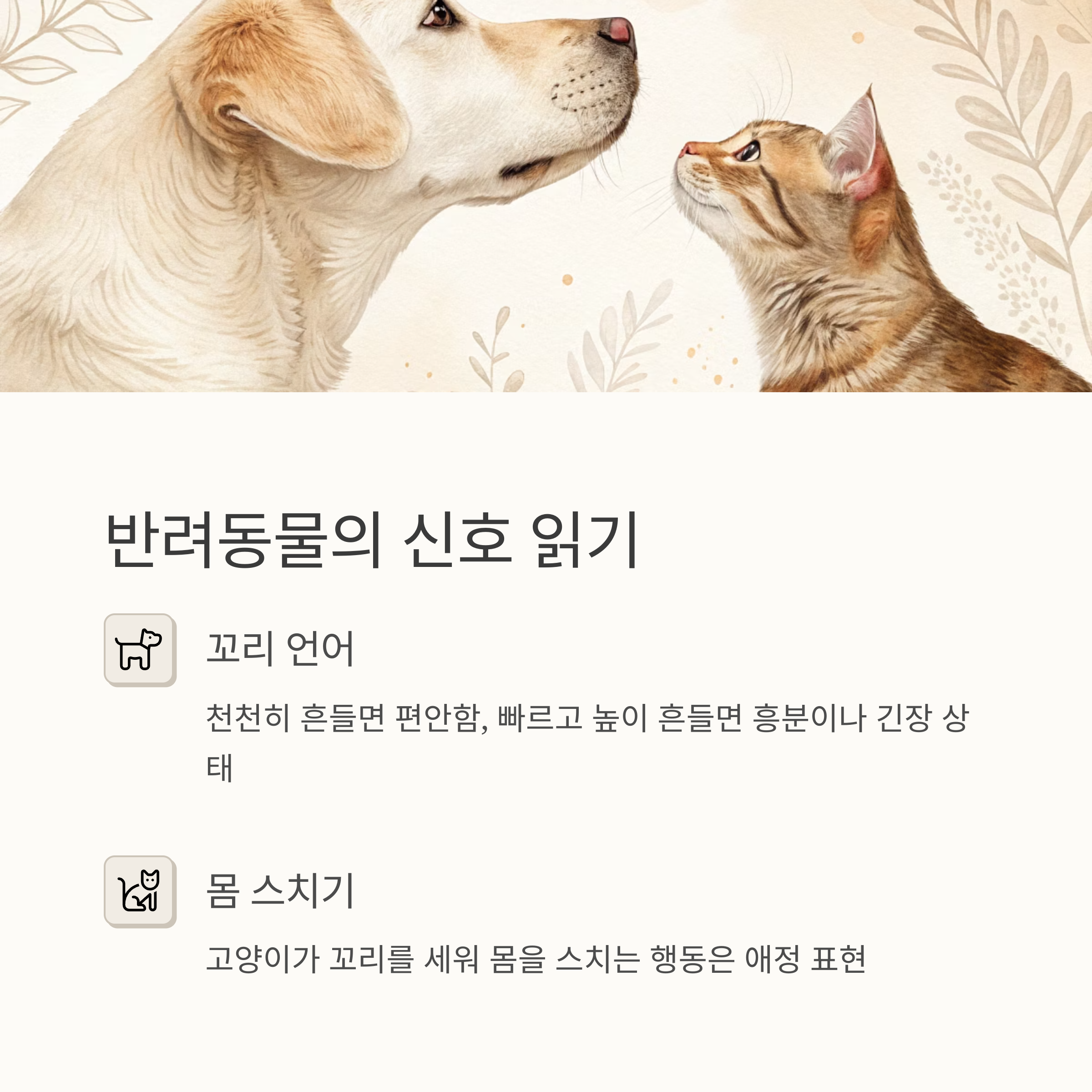 반려동물은 말을 할 수는 없지만, 다양한 신체 언어와 행동으로 우리에게 많은 신호를 보내요. 예를 들어, 강아지가 꼬리를 천천히 흔들면 편안함을 나타내지만, 빠르고 높이 흔들면 흥분하거나 긴장한 상태일 수 있답니다. 고양이는 꼬리를 세워 몸을 스치는 행동으로 애정을 표현하고요. 이렇게 반려동물의 작은 행동을 이해하면, 더 깊이 있는 교감이 가능해져요.