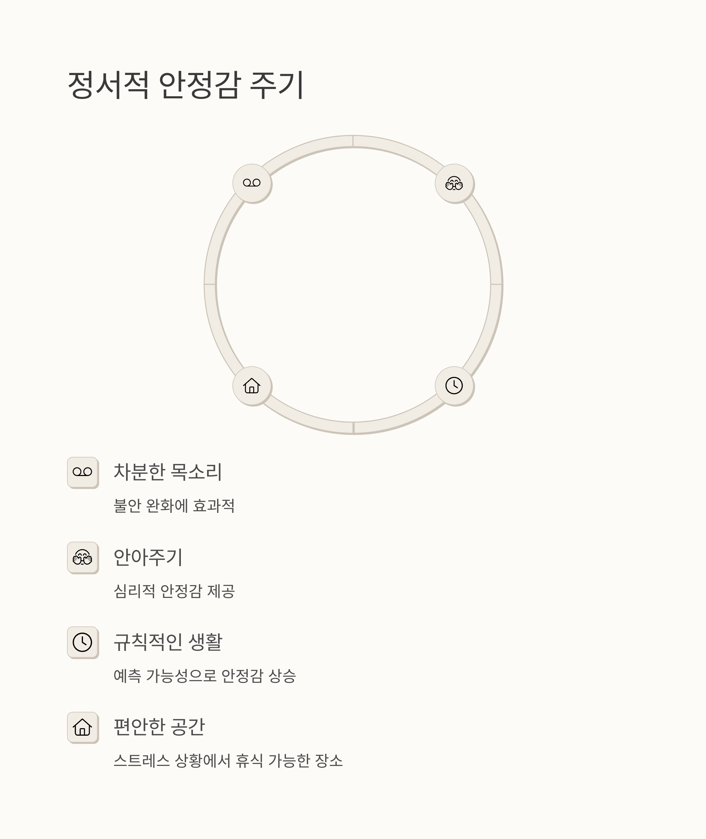 | 규칙적인 생활 패턴 유지 | 예측 가능성으로 안정감 상승 | 갑작스러운 변화는 피하기 |
