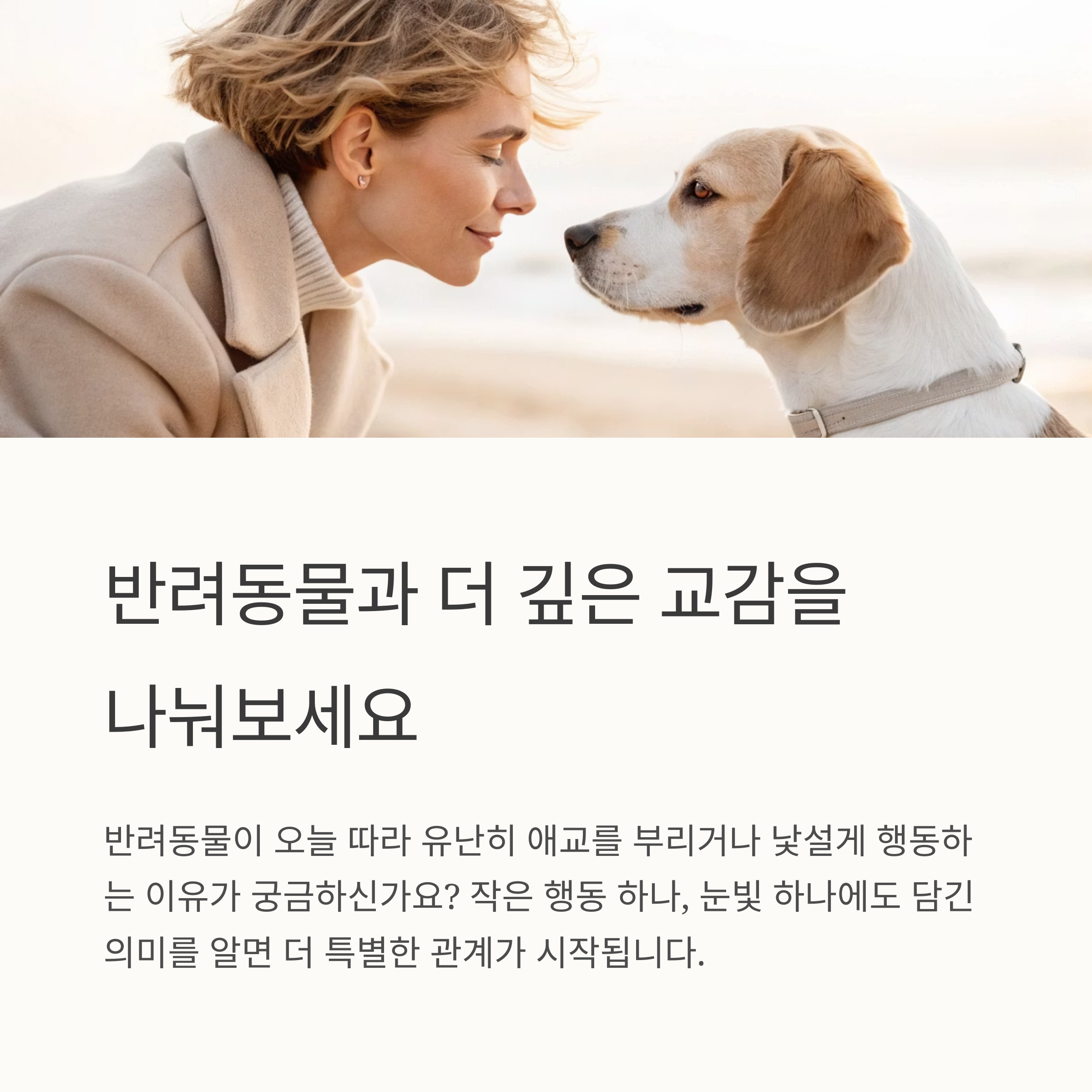 안녕하세요, 여러분! 저는 오랜 시간 반려동물과 함께 살아오면서 다양한 교감법을 직접 경험해본 애묘인 겸 애견인이에요. 몇 년 전 첫 반려묘를 입양했을 때는 어떻게 소통해야 할지 몰라 정말 헤맸던 기억이 나요. 하지만 시간이 흐르면서 작은 행동 하나, 눈빛 하나에도 서로 마음이 통하는 느낌을 받게 되더라고요. 그래서 오늘은 반려동물과 좀 더 깊이 있고 따뜻한 교감을 나누는 방법에 대해 함께 이야기해볼까 해요. 커피 한 잔 내려놓고, 저와 함께 반려동물의 세계로 한 걸음 들어가볼까요?