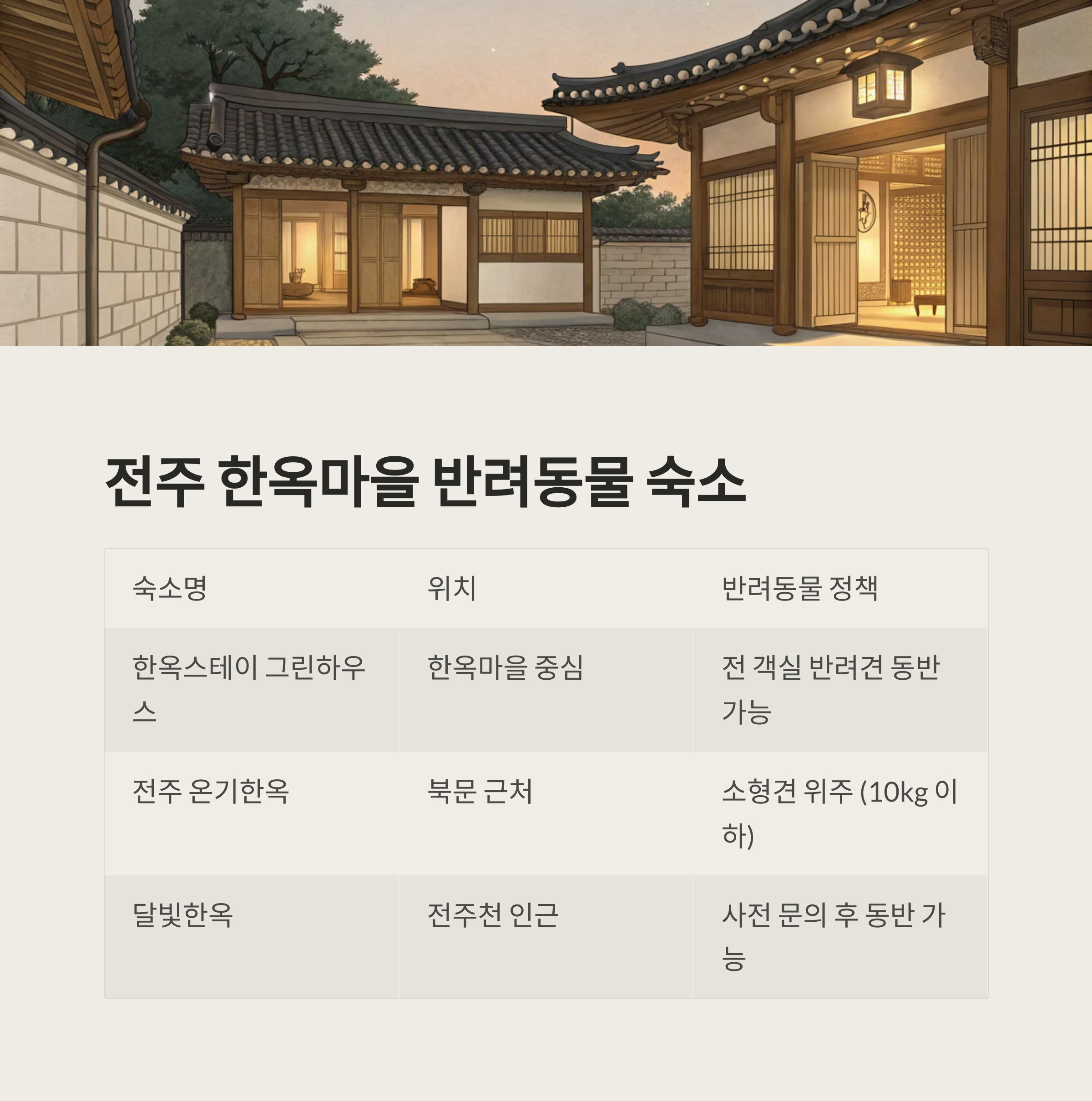 전주 한옥마을은 전통과 현대가 어우러진 멋진 여행지인데요. 요즘 반려동물과 함께 묵을 수 있는 한옥 숙소도 많이 생겼어요. 분위기 있는 한옥에서 반려견과 함께 머물면 정말 특별한 추억이 되더라구요. 제가 다녀온 숙소 정보를 테이블로 정리해볼게요.