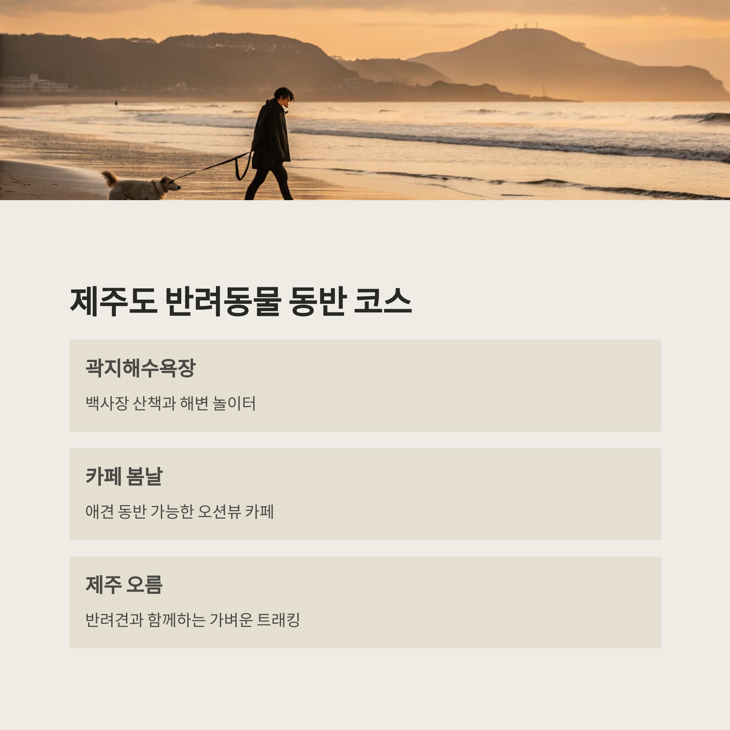 제주도는 말이 필요 없는 여행지죠. 반려동물과 함께 가기에도 정말 좋은 곳이에요. 공항부터 반려견 동반이 가능한 렌터카 업체들이 많고, 펫프렌들리 카페와 레스토랑도 점점 늘고 있어요. 제가 추천하는 코스를 정리해볼게요.