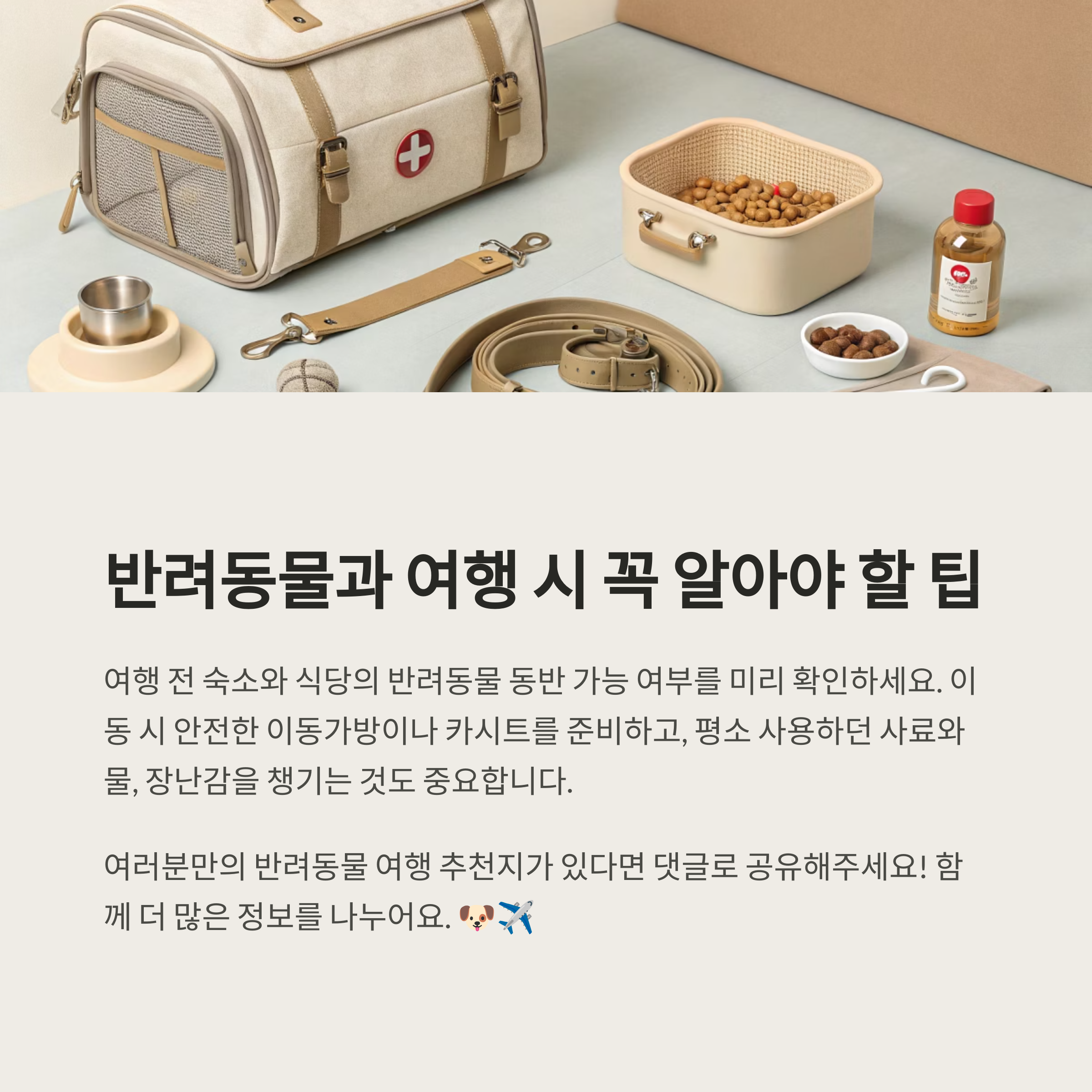 오늘 소개해드린 반려동물과 함께하는 국내 여행지 BEST 5, 어떠셨나요? 🐾 반려동물과 함께라면 어디든 특별한 추억이 되는 것 같아요. 물론 준비할 것도 많고 신경 쓸 것도 있지만, 함께하는 그 시간이 정말 소중하잖아요. 여러분도 이번 주말에는 반려동물과 함께 근교라도 나들이 가보시는 건 어떨까요? 혹시 여러분만의 추천 여행지가 있다면 댓글로 꼭 공유해 주세요! 우리 함께 더 많은 정보를 나누고, 행복한 여행을 만들어봐요. 😊