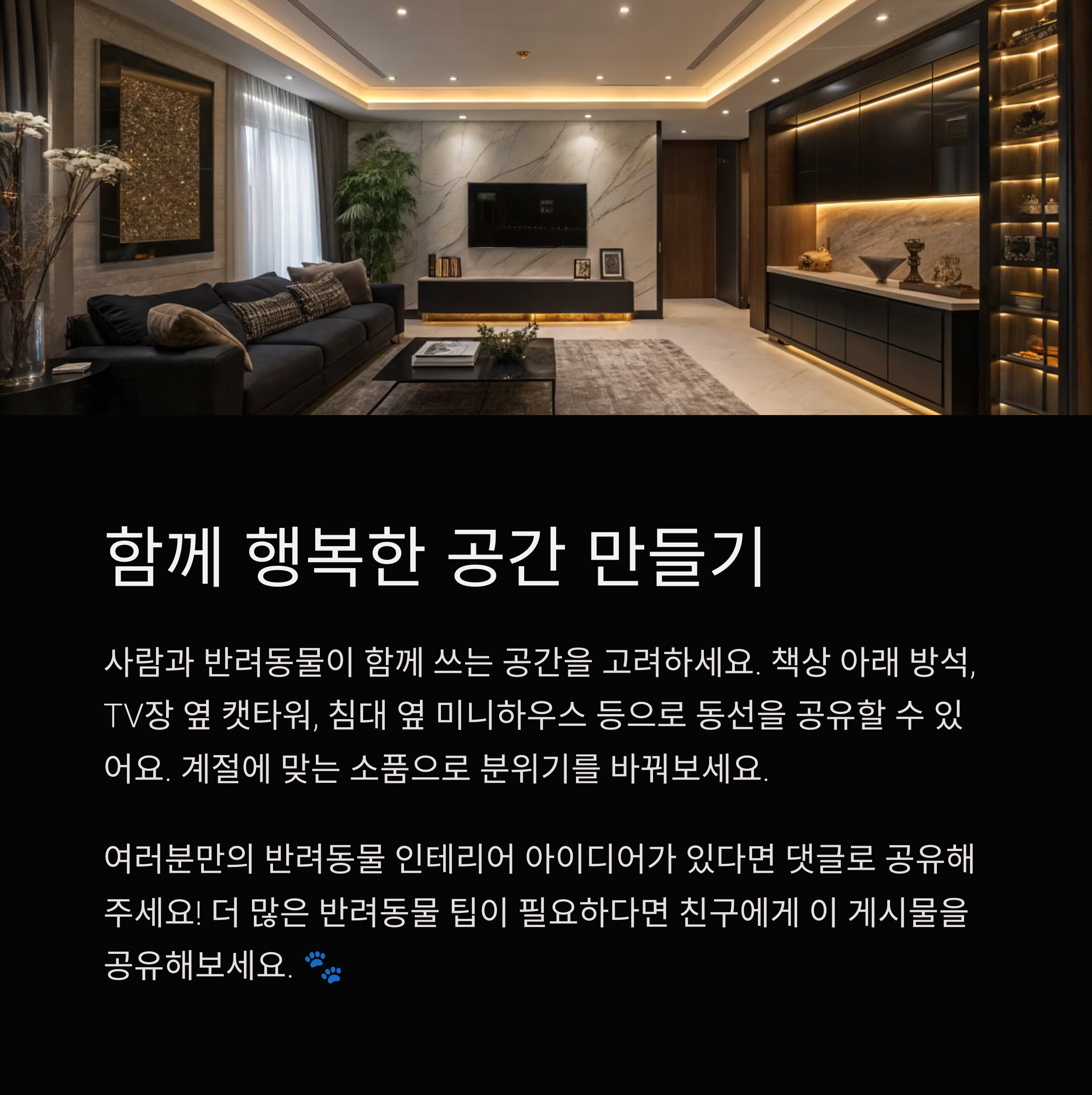 오늘 함께 살펴본 '반려동물과 함께하는 집꾸미기' 어떠셨나요? 저는 나리 덕분에 집을 더 따뜻하게 바라보게 된 것 같아요. 인테리어는 단순히 예쁜 집을 만드는 게 아니라, 함께 사는 존재 모두의 행복을 고려하는 과정이죠. 여러분도 반려동물과의 추억이 가득한, 그런 공간을 만들어보시길 바랄게요. 혹시 직접 실천하신 아이디어가 있다면 댓글로 꼭 공유해주세요. 우리 같이 더 나은 집, 더 행복한 일상을 만들어봐요!