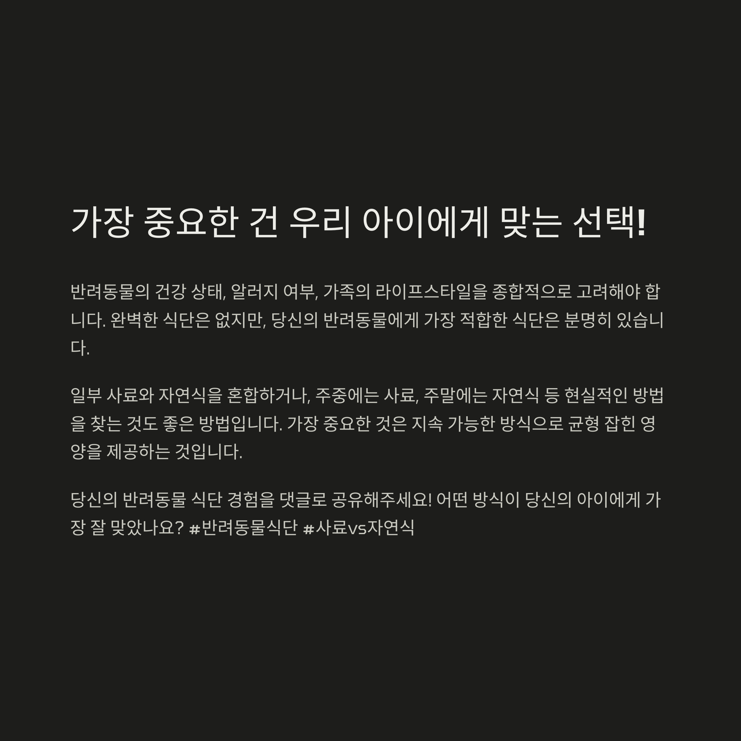 결국 정답은 없습니다. 어떤 방식이든 내 반려동물에게 잘 맞는 게 최고예요. 중요한 건 우리의 선택이 사랑이라는 사실이죠. 매일매일의 급식 시간도 반려동물과의 소중한 교감이고, 내가 선택한 음식이 아이의 건강을 책임진다는 책임감이 필요해요. 오늘 글이 여러분의 선택에 조금이나마 도움이 되었길 바랍니다. 댓글로 여러분의 경험도 나눠주세요, 진심으로 궁금하거든요!