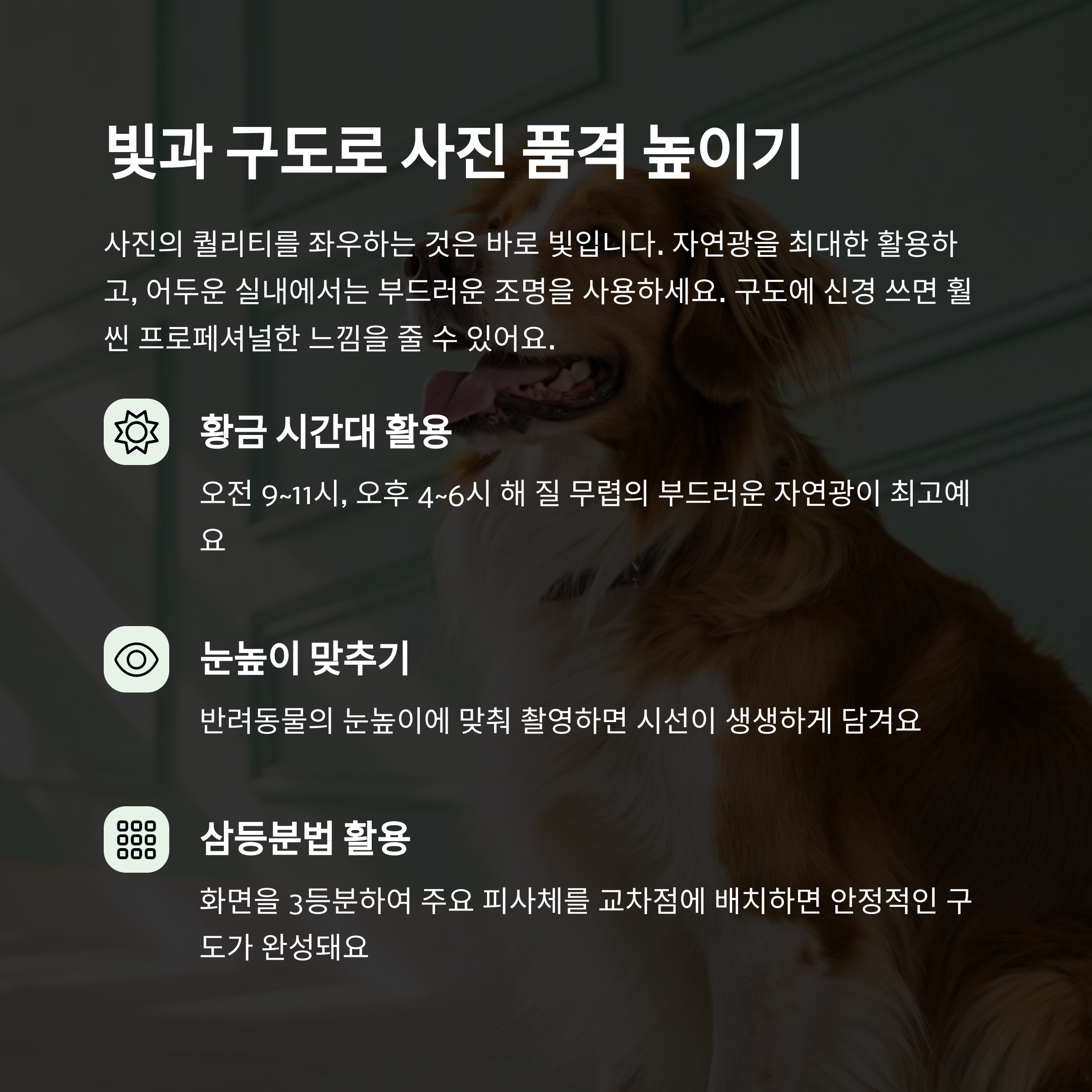 직접 조명보다는 부드러운 빛이 반려동물의 털과 눈망울을 더 예쁘게 담아줘요.