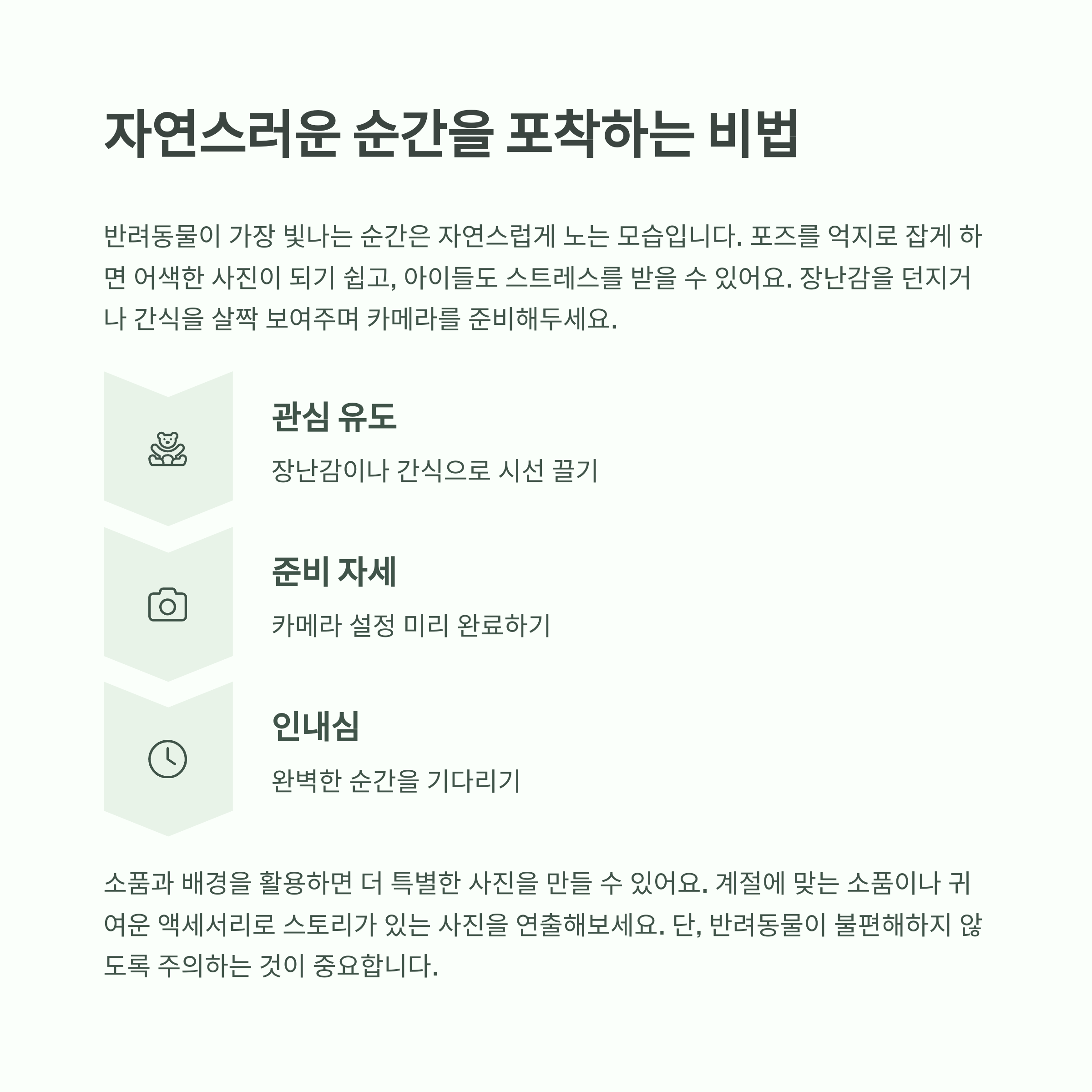 조금 더 특별한 분위기를 원한다면 소품과 배경을 활용해보세요. 계절에 맞는 소품이나 귀여운 액세서리를 준비하면 사진에 스토리가 생겨요. 단, 소품이 반려동물을 가리거나 불편하게 하지 않도록 주의해야 합니다.