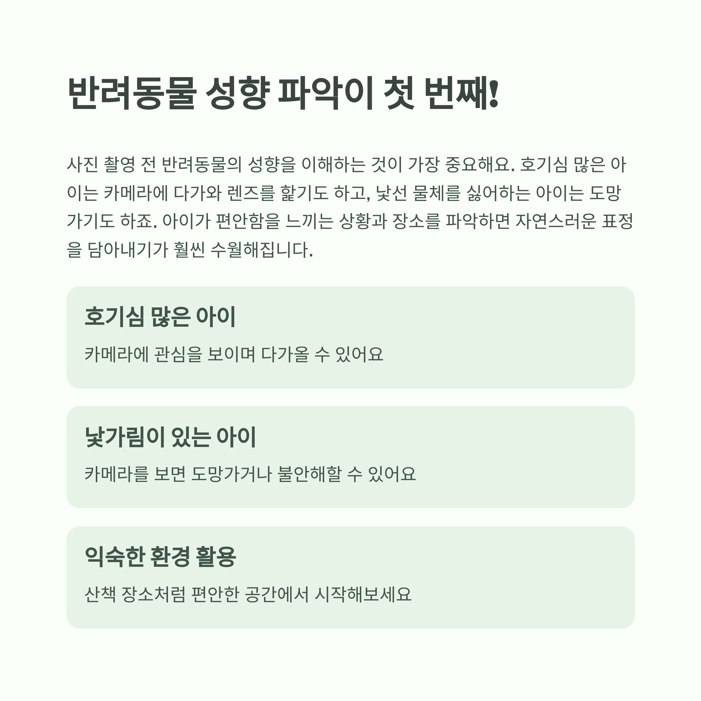 - 반려동물 눈높이에 맞춰 촬영