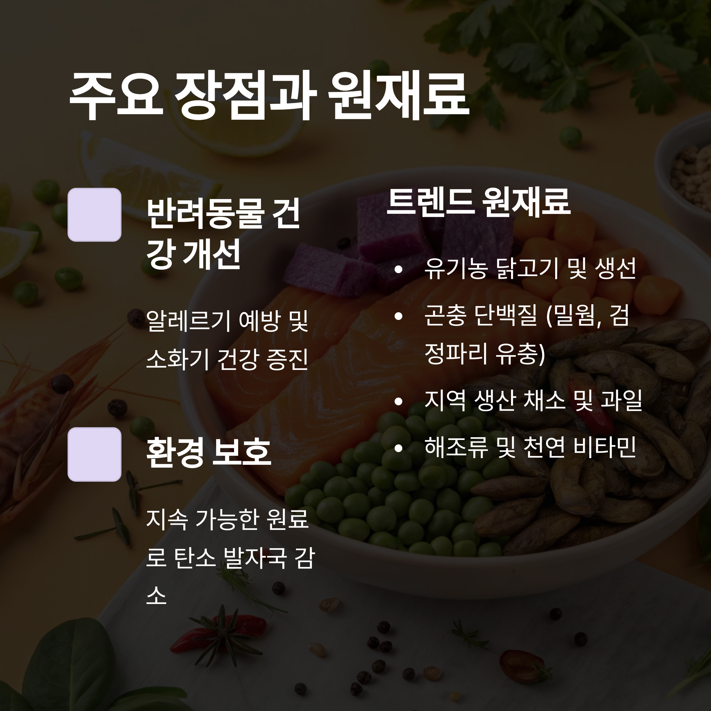 | 반려동물 건강 개선 | 유기농, 무첨가 원료로 알레르기 예방 및 소화기 건강 증진 |