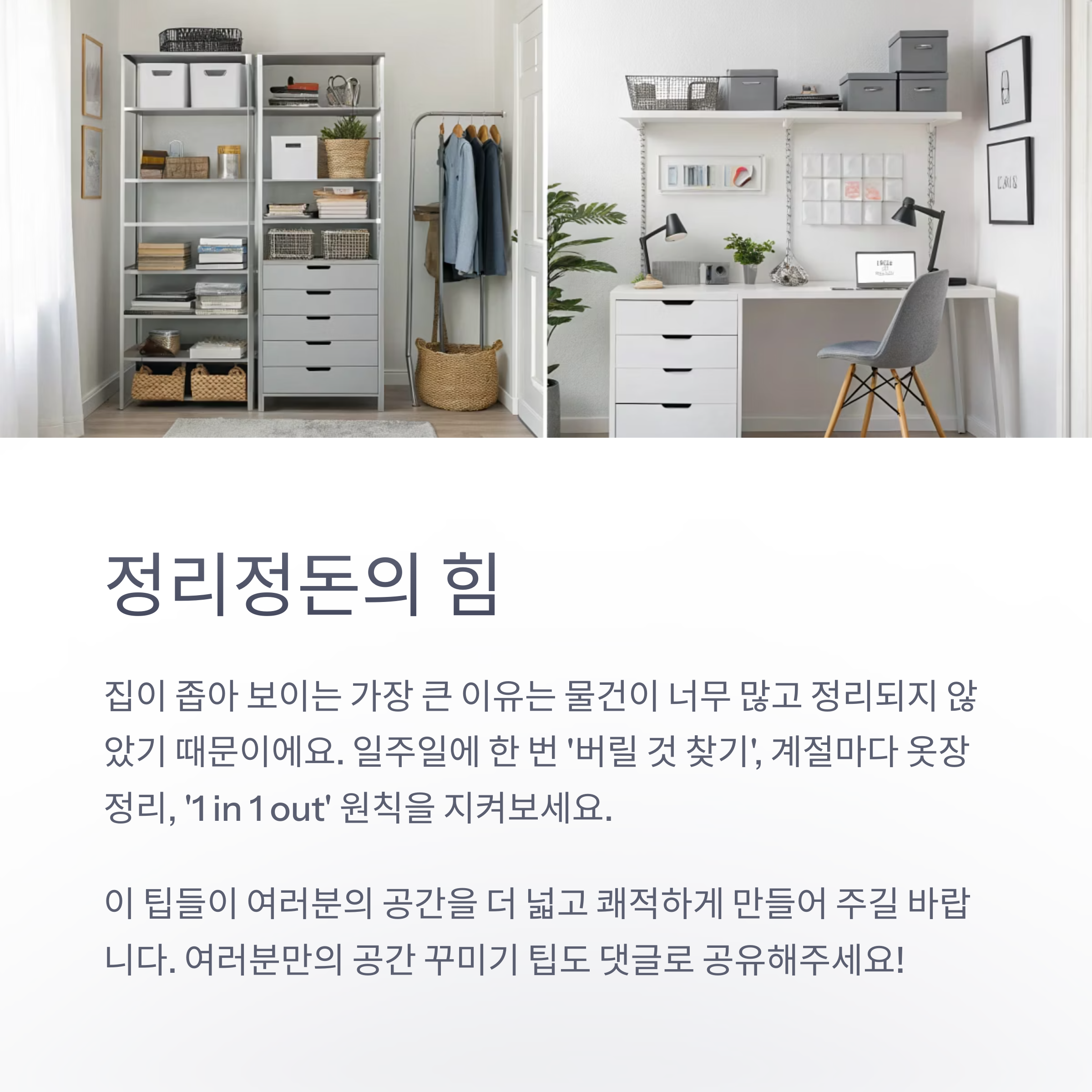 가장 기본적이면서도 가장 효과적인 방법, 바로 정리정돈입니다. 집이 좁아 보이는 가장 큰 이유는 물건이 너무 많고, 제대로 정리되지 않았기 때문이에요. 꼭 필요한 것만 남기고 나머지는 정리해보세요. 아래는 제가 실천 중인 정리 루틴이에요.