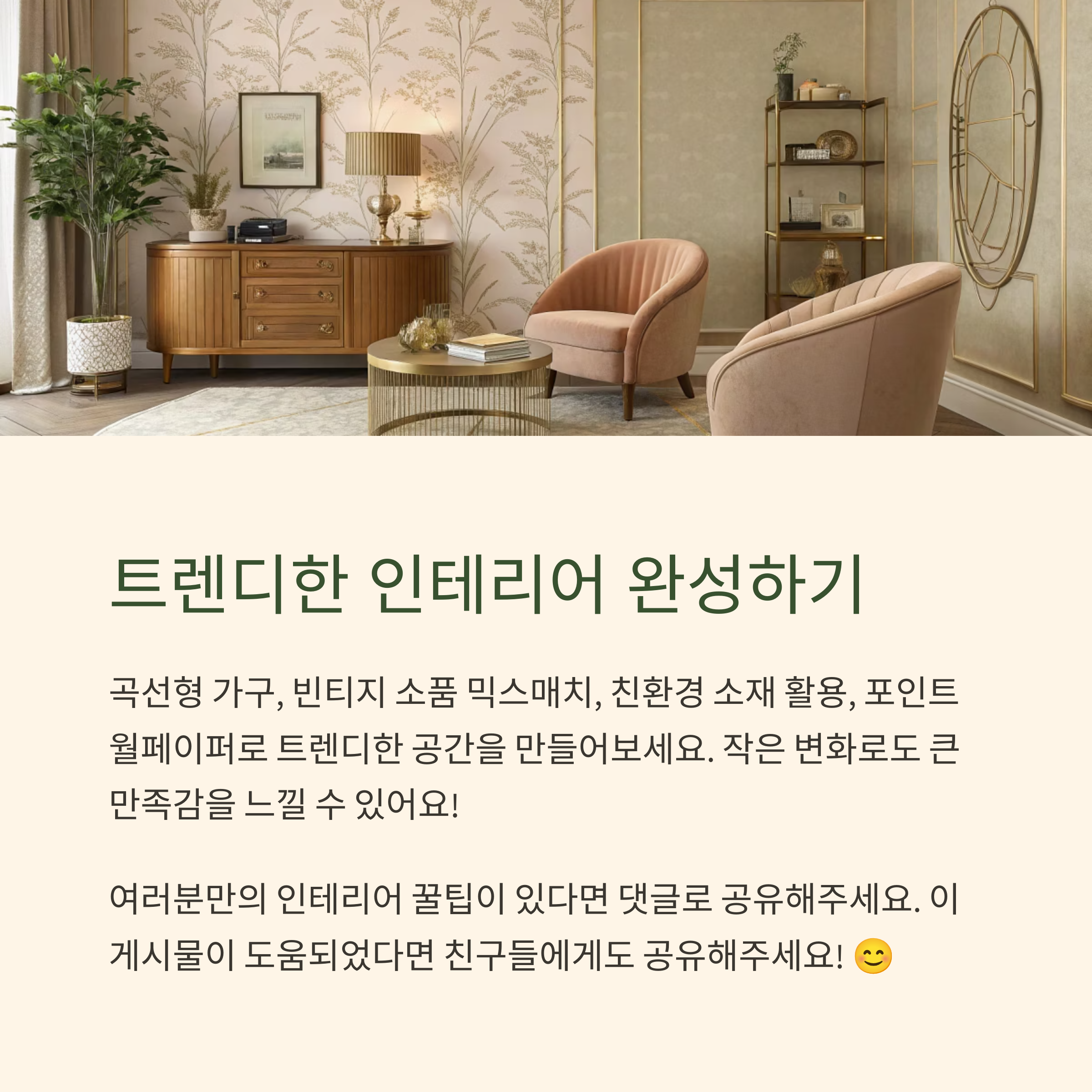 오늘 소개한 예산별 인테리어 꿀팁, 어떠셨나요? 사실 저도 예전에는 인테리어가 거창하고 복잡하게만 느껴졌는데, 이렇게 하나씩 시도해보니 훨씬 재미있고 부담도 적더라고요. 여러분도 이번 기회에 우리 집에 작은 변화를 줘보면 어떨까요? 혹시 다른 꿀팁이나 궁금한 점 있으면 댓글로 꼭 남겨주세요. 여러분과 인테리어 이야기도 나누고 싶어요! 😊