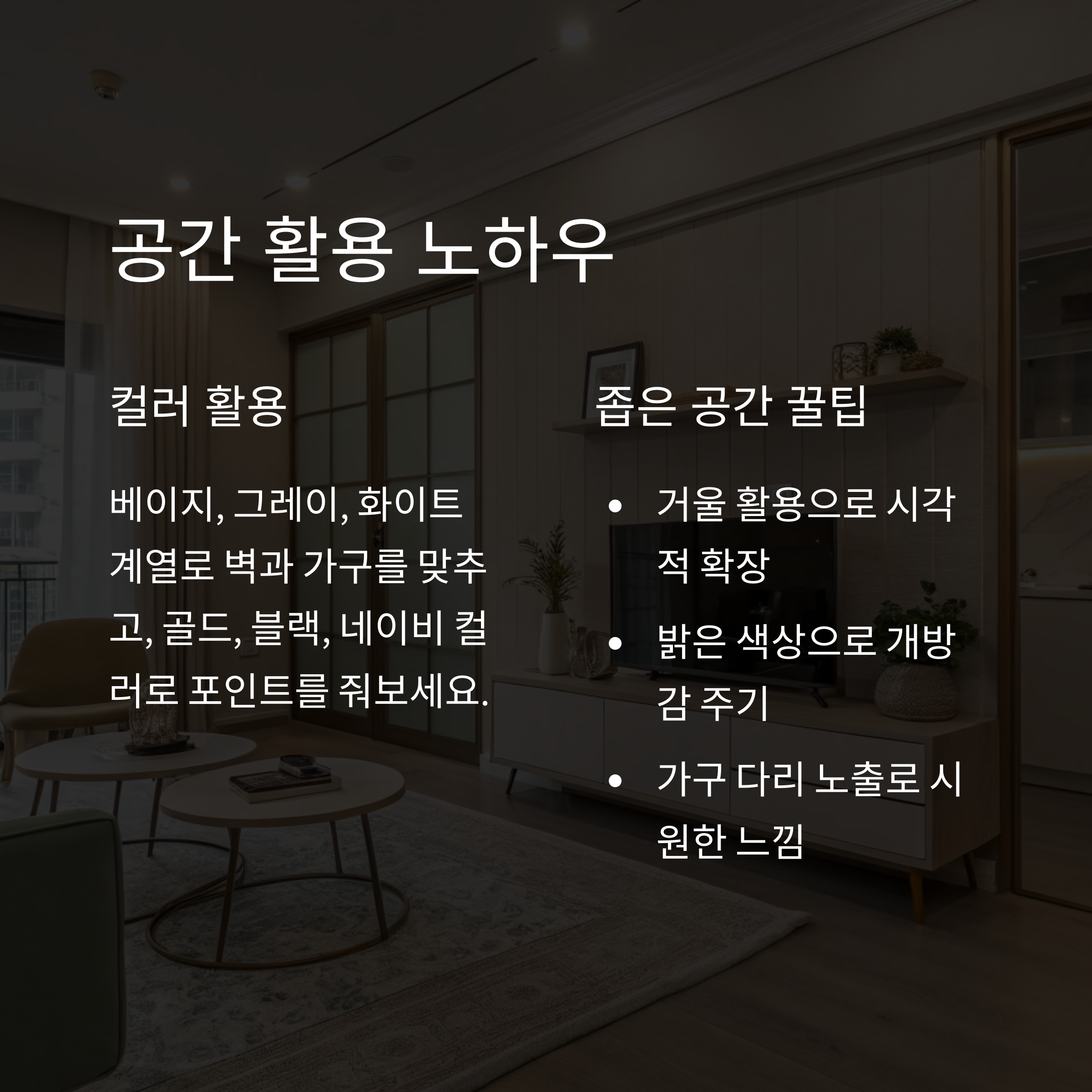 거울, 밝은 색상, 가구 다리 노출 등이 좋아요. 시각적으로 확장 효과를 줄 수 있거든요.