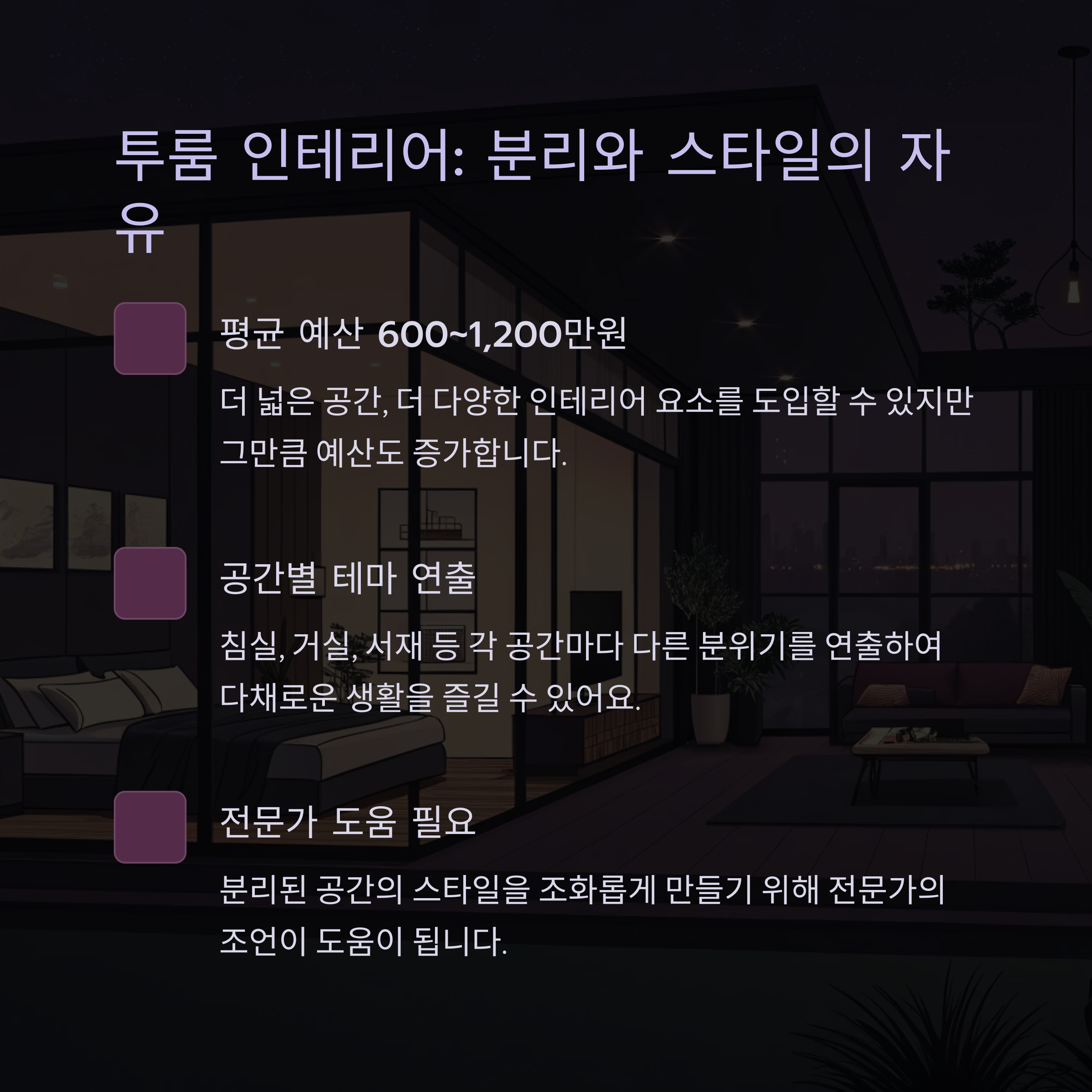 기본적으로 면적이 커서 인테리어 예산도 더 필요하지만, 심플하게 꾸미면 오히려 효율적일 수도 있어요.