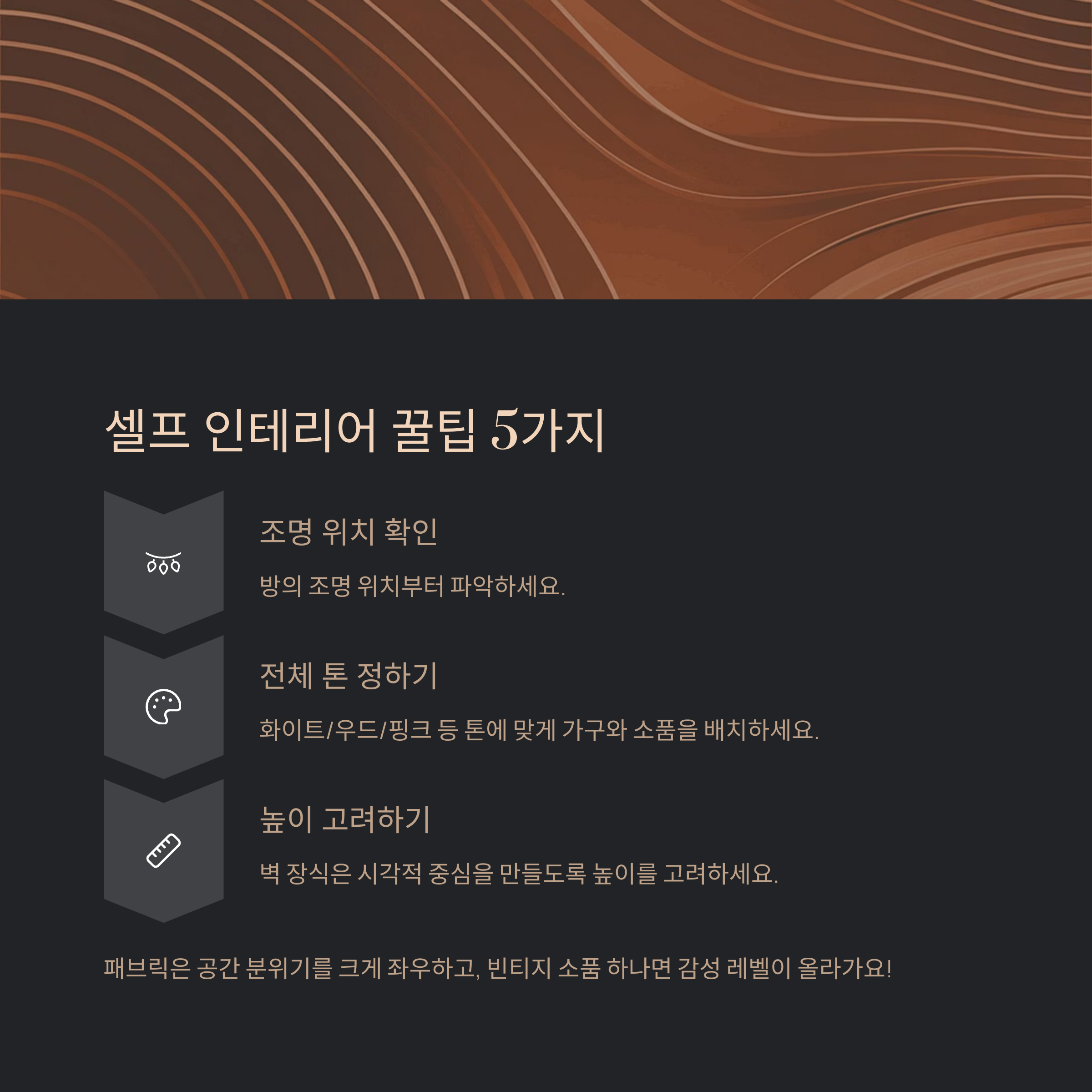 셀프로 방을 꾸미려면 계획이 진짜 중요해요. 그냥 예쁜 거 사다 붙이는 거랑, 테마를 잡고 하나하나 맞춰가는 거랑 결과물이 완전히 다르거든요. 아래 팁들을 참고해서 여러분만의 스타일을 만들어 보세요!