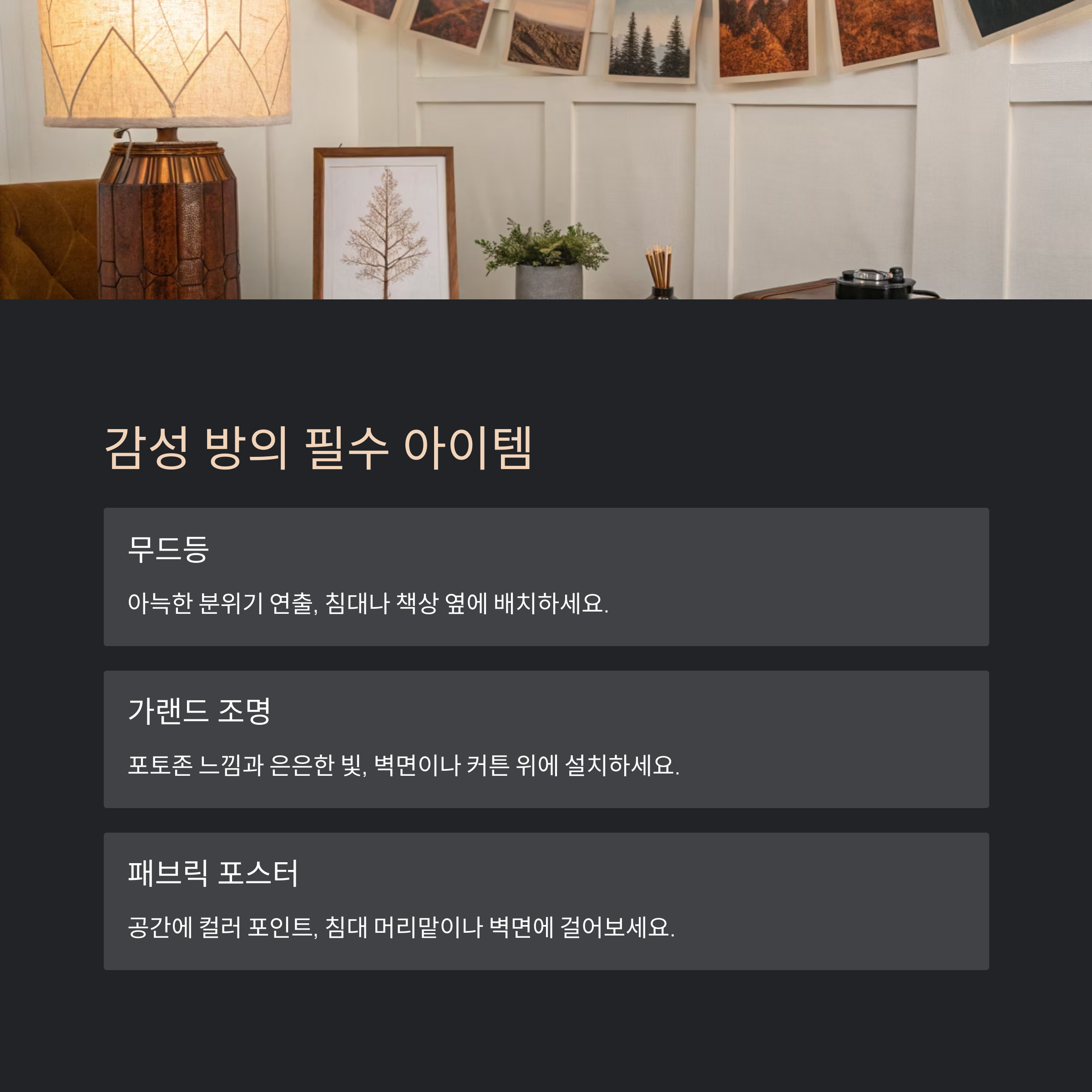 | 무드등 | 공간에 아늑한 분위기 추가 | 침대 옆, 책상 옆 |