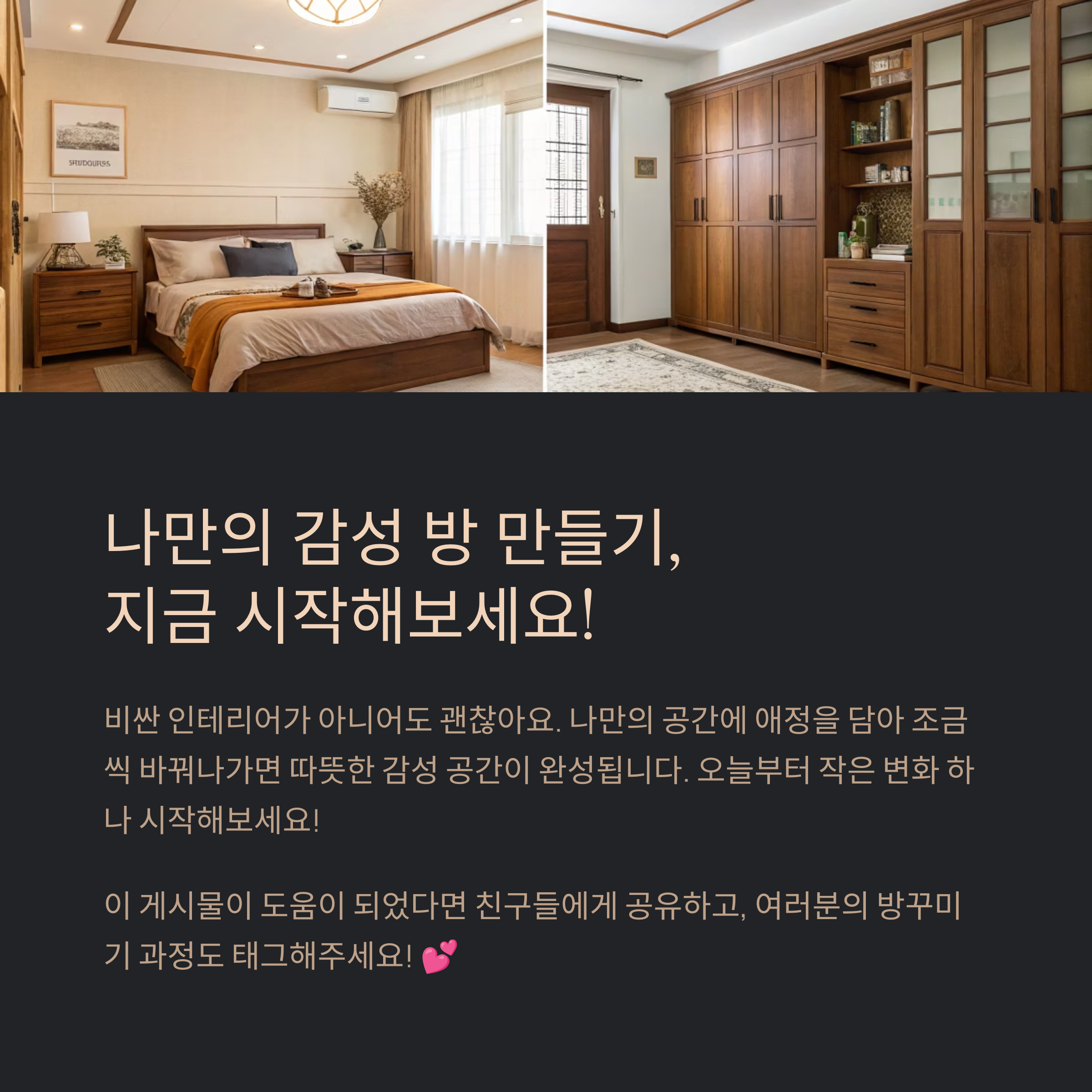 오늘 제가 경험한 인스타 감성 방꾸미기 여정, 어떠셨나요? 처음엔 막막하게 느껴졌던 게 지금은 소소한 즐거움이 되었어요. 꼭 비싼 인테리어가 아니더라도, 나만의 공간에 애정을 담아 조금씩 바꿔나간다면 그 자체로 충분히 감성적이고 따뜻한 공간이 완성된답니다. 여러분도 오늘 이 글을 계기로 방 한켠에 작은 변화 하나 시작해보시는 건 어때요? 분명히 큰 만족으로 돌아올 거예요. 다음 글에서는 '자취방을 호텔처럼 만드는 팁'에 대해 다뤄볼게요. 기대해 주세요!