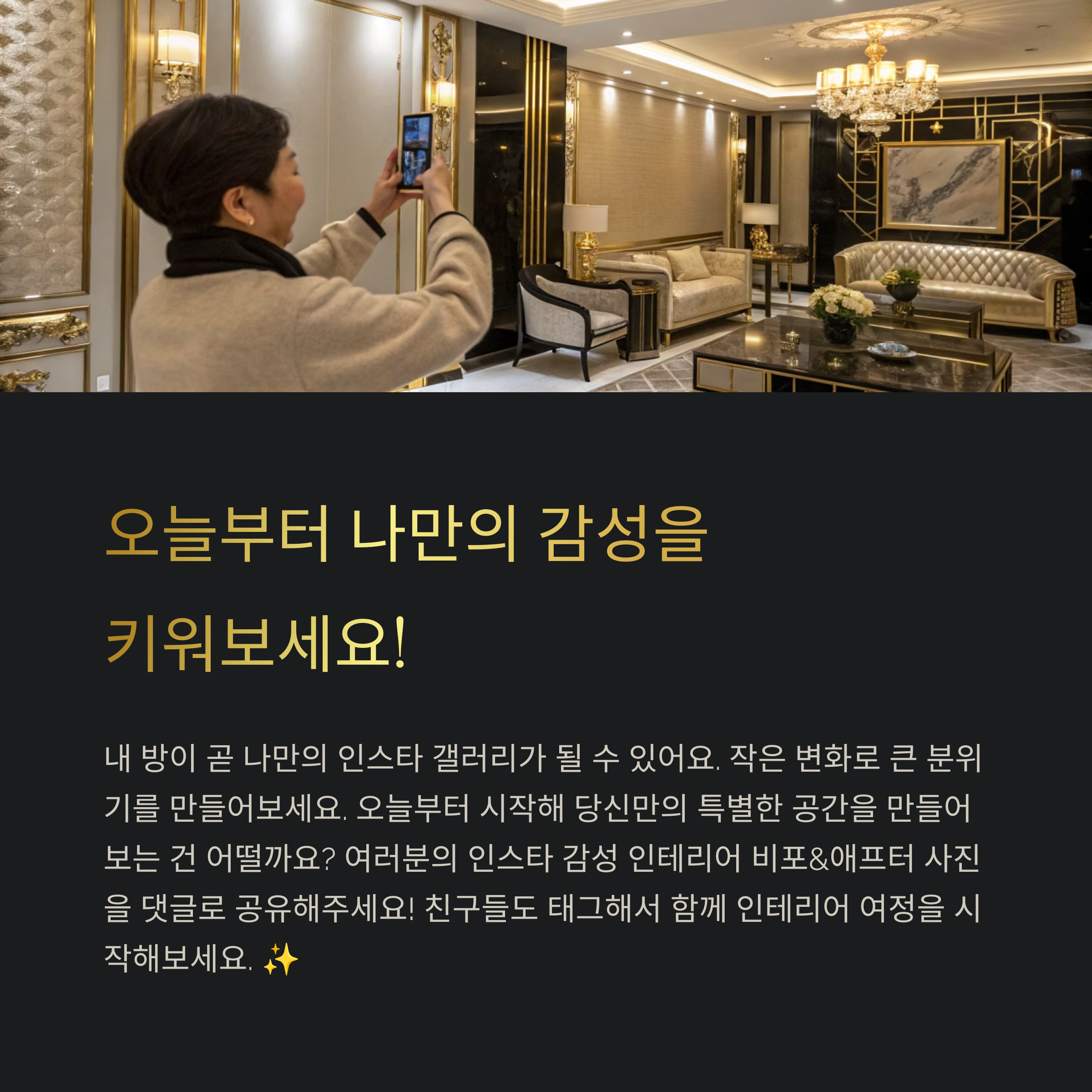 여러분, 인테리어는 결국 나를 위한 거예요. 남의 눈을 의식해서 꾸미는 게 아니라, 내가 가장 편하고 행복하게 쉴 수 있는 공간을 만드는 게 진짜죠. 인스타 감성이라고 해서 부담 가질 필요 없어요. 여러분만의 색깔로, 감성으로, 지금 당장 가능한 것부터 하나씩 시도해보세요. 저처럼 작은 변화가 결국 큰 만족으로 이어질 거예요. 오늘의 이 글이 여러분의 감성 인테리어 여정에 작은 도움이 되었기를 진심으로 바랍니다. 함께 더 감성 넘치는 공간을 만들어봐요!
