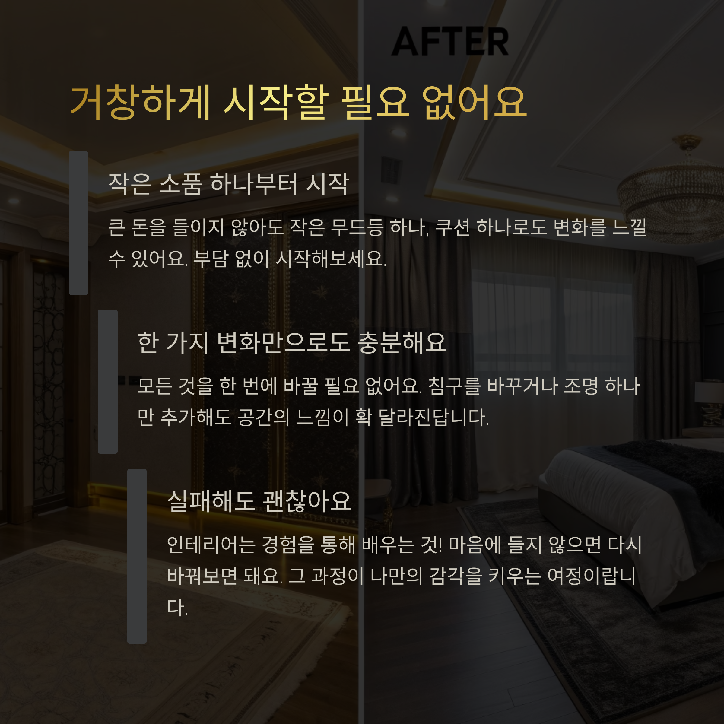 | 벽면 | 하얀 벽+포스터 없음 | 베이지톤 벽지+감성 액자 |