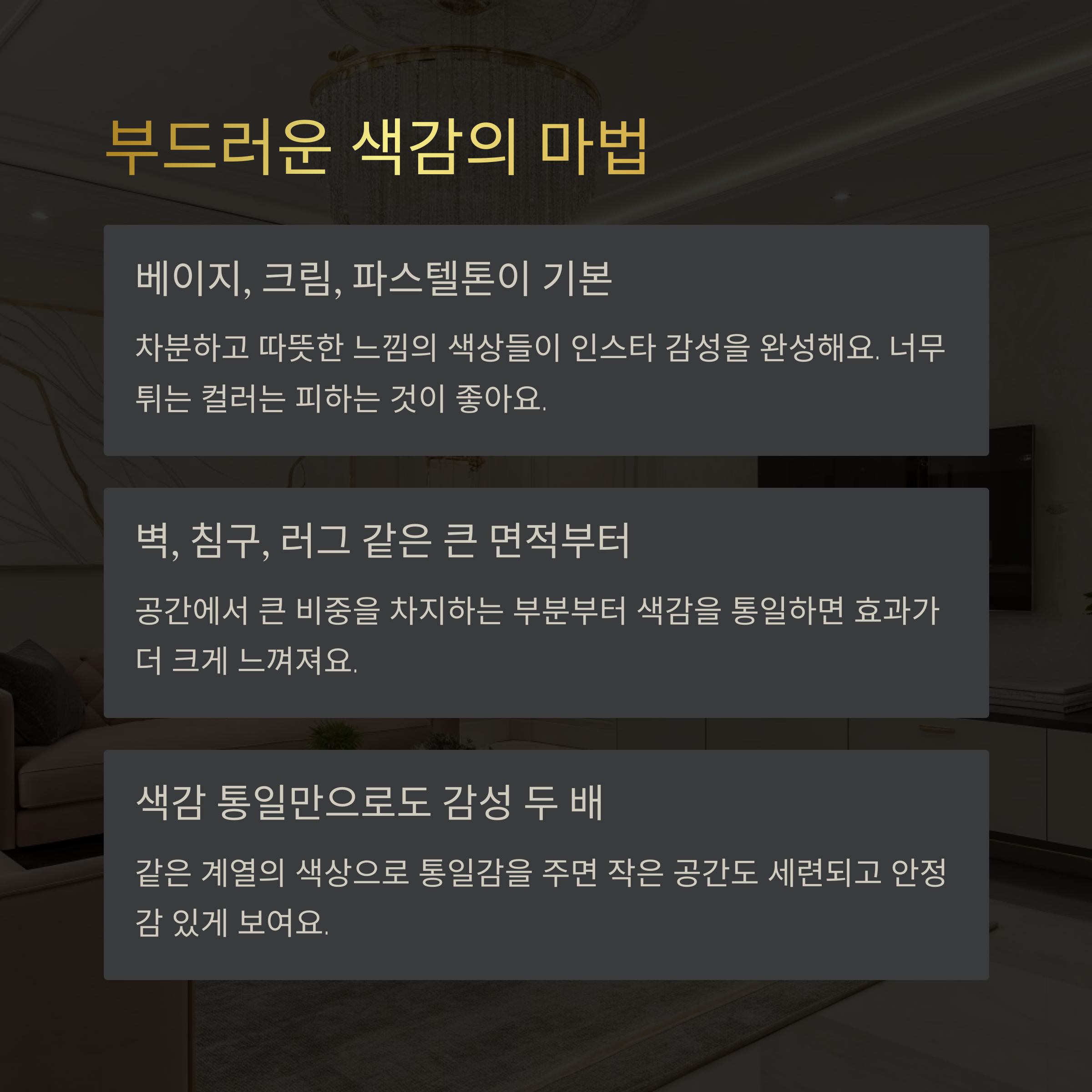 아이보리, 베이지, 파스텔톤이 좋아요. 너무 강한 색보다는 부드럽고 차분한 색상이 감성 무드를 만들어줘요.