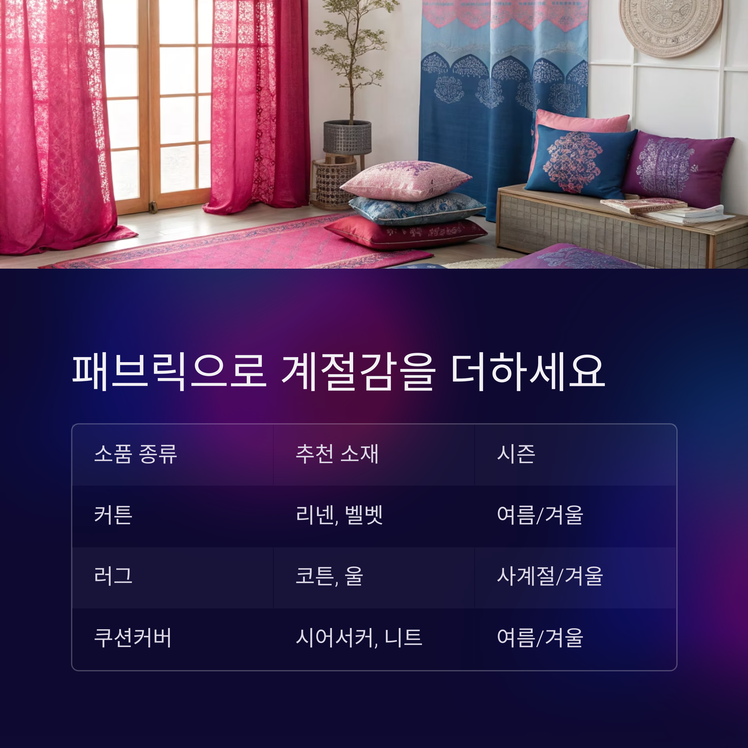 | 커튼 | 리넨, 벨벳 | 여름 / 겨울 |