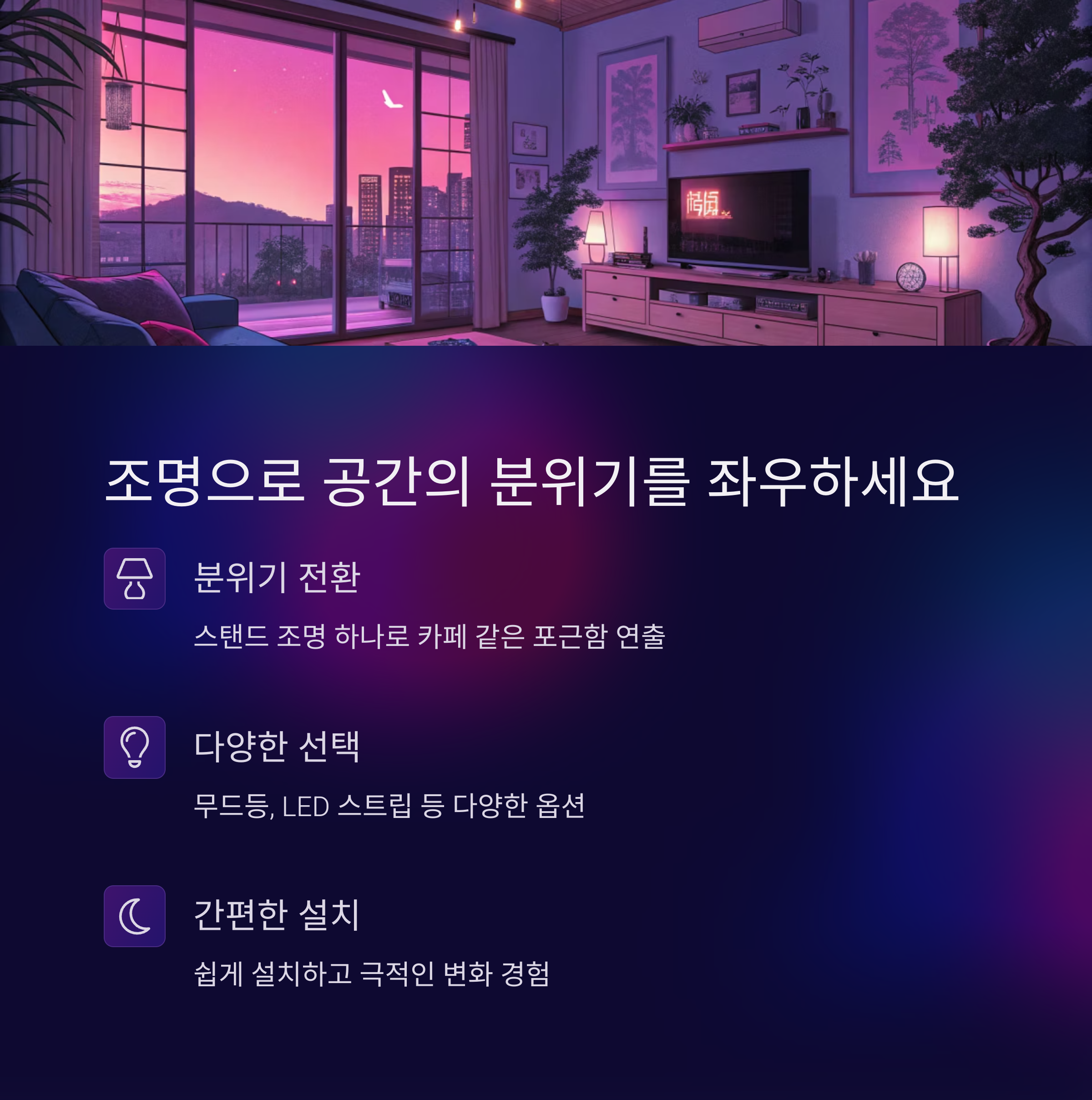 조명은 공간의 분위기를 결정짓는 가장 강력한 요소 중 하나예요. 밝기, 색온도, 디자인에 따라 같은 공간도 전혀 다른 느낌이 나죠. 저녁에 스탠드 조명 하나만 켜도, 마치 카페에 온 것 같은 포근한 느낌을 줄 수 있거든요. 특히 요즘은 감성 조명으로 인기를 끌고 있는 무드등이나 LED 스트립 등이 다양하게 나와 있어서 선택의 폭도 넓어요. 간단하게 설치할 수 있으면서도 극적인 분위기 전환이 가능한 게 조명의 가장 큰 장점이죠.