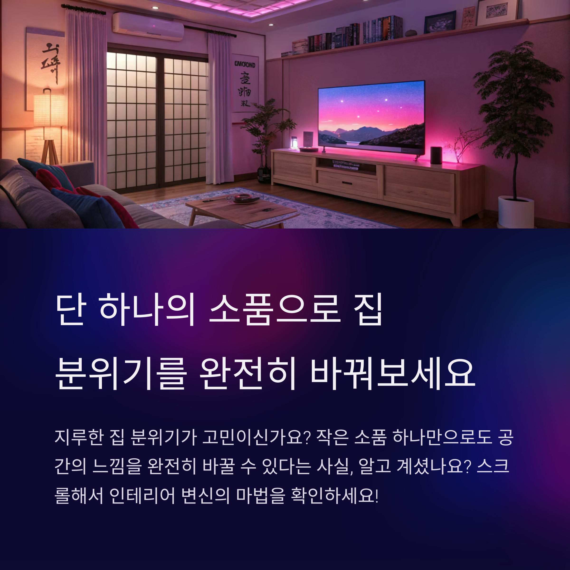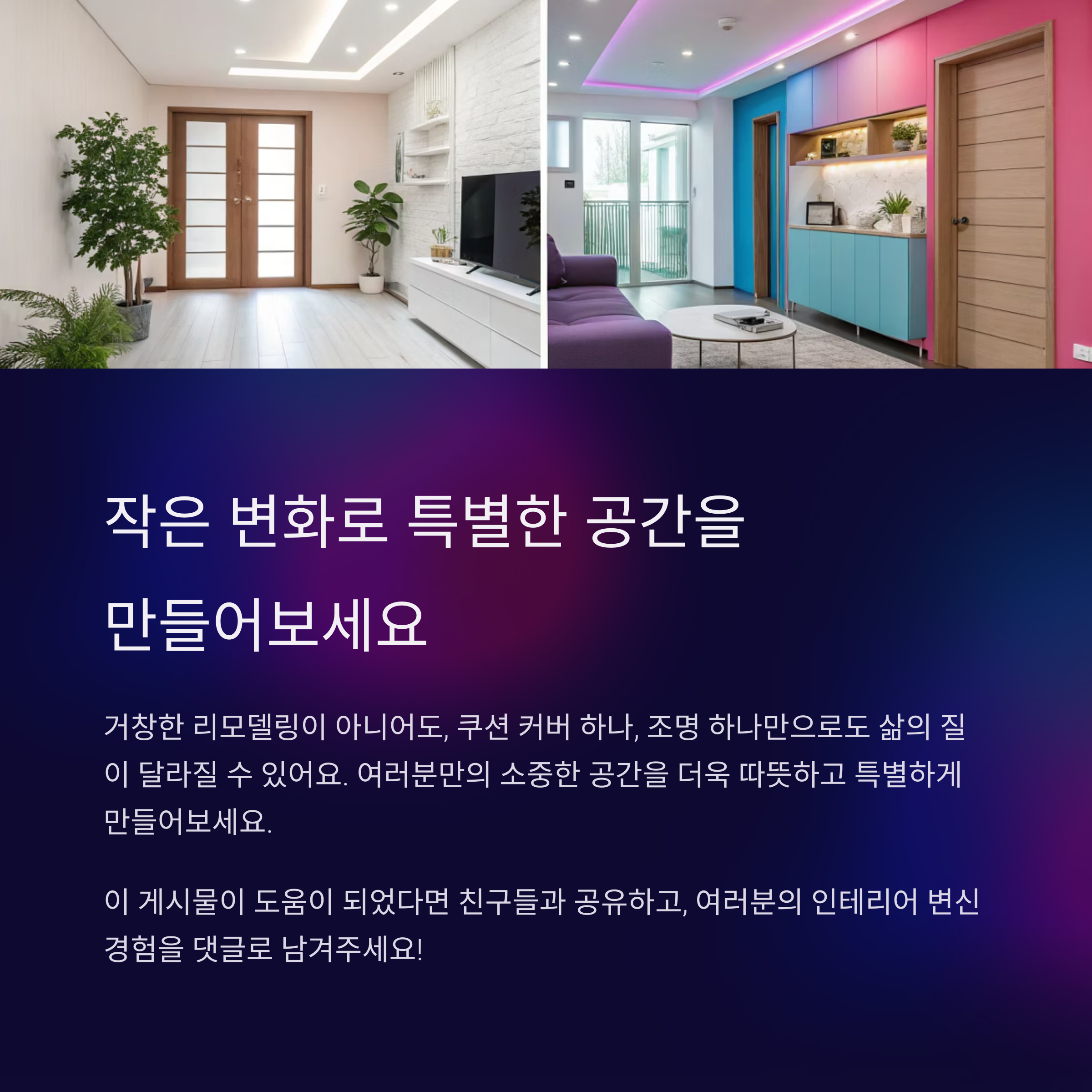 오늘 소개한 인테리어 소품 팁들, 어떠셨나요? 사실 우리 모두 마음속에 "집을 좀 바꿔보고 싶다"는 작은 소망 하나쯤은 갖고 있잖아요. 거창한 리모델링이 아니어도, 쿠션 커버 하나 바꾸고 조명 하나 바꾸는 것만으로도 삶의 질이 달라질 수 있어요. 저는 그걸 정말 실감했거든요. 여러분도 꼭 해보시고, 여러분만의 소중한 공간을 더욱 따뜻하고 특별하게 만들어보세요. 마음에 드는 변화가 있다면 댓글로 경험도 공유해 주세요. 저도 궁금하답니다!