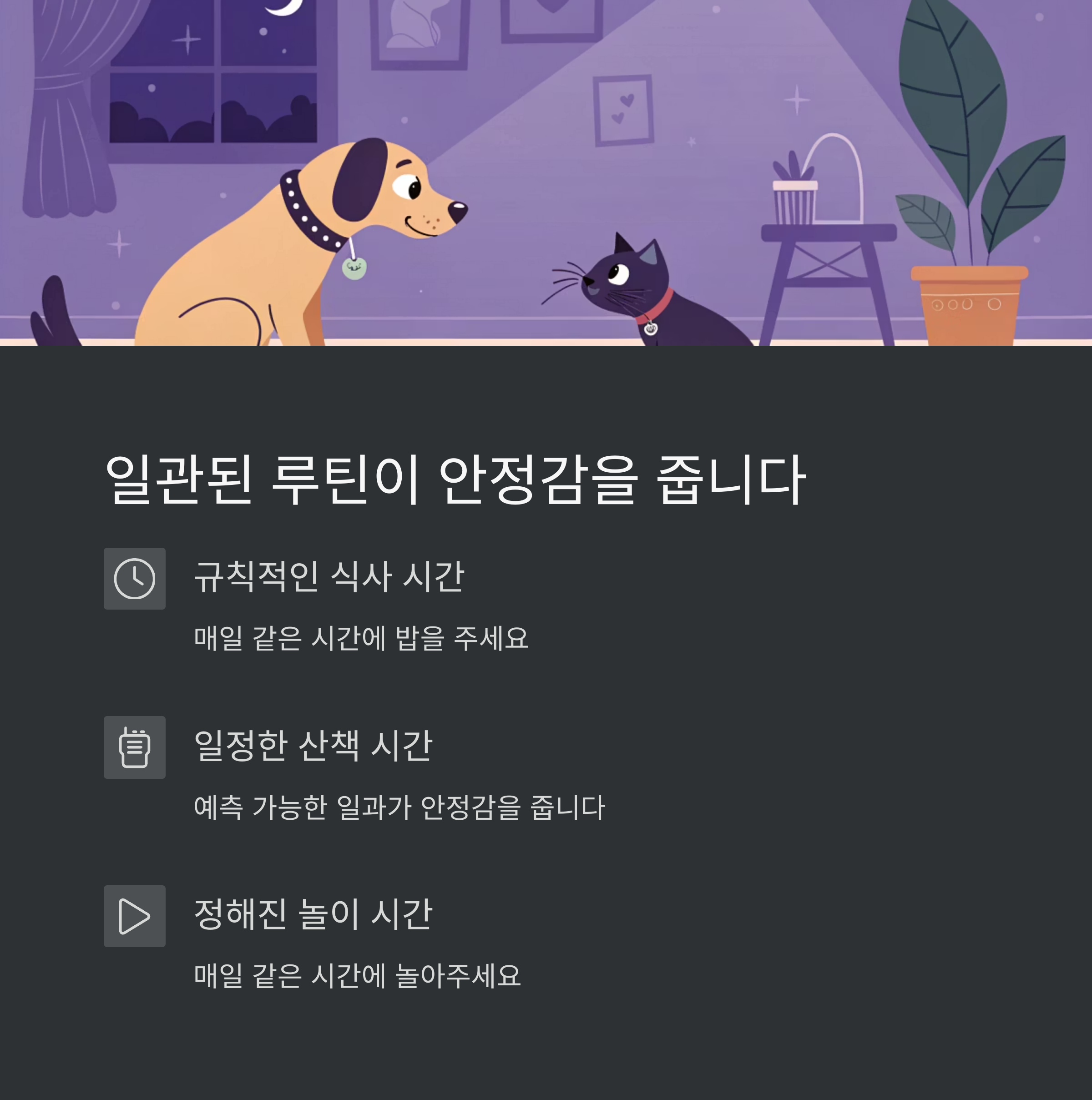 예측 가능한 생활은 반려동물에게 큰 안정감을 줍니다. 규칙적인 식사, 산책, 놀이 시간은 스트레스 완화에 핵심이에요.