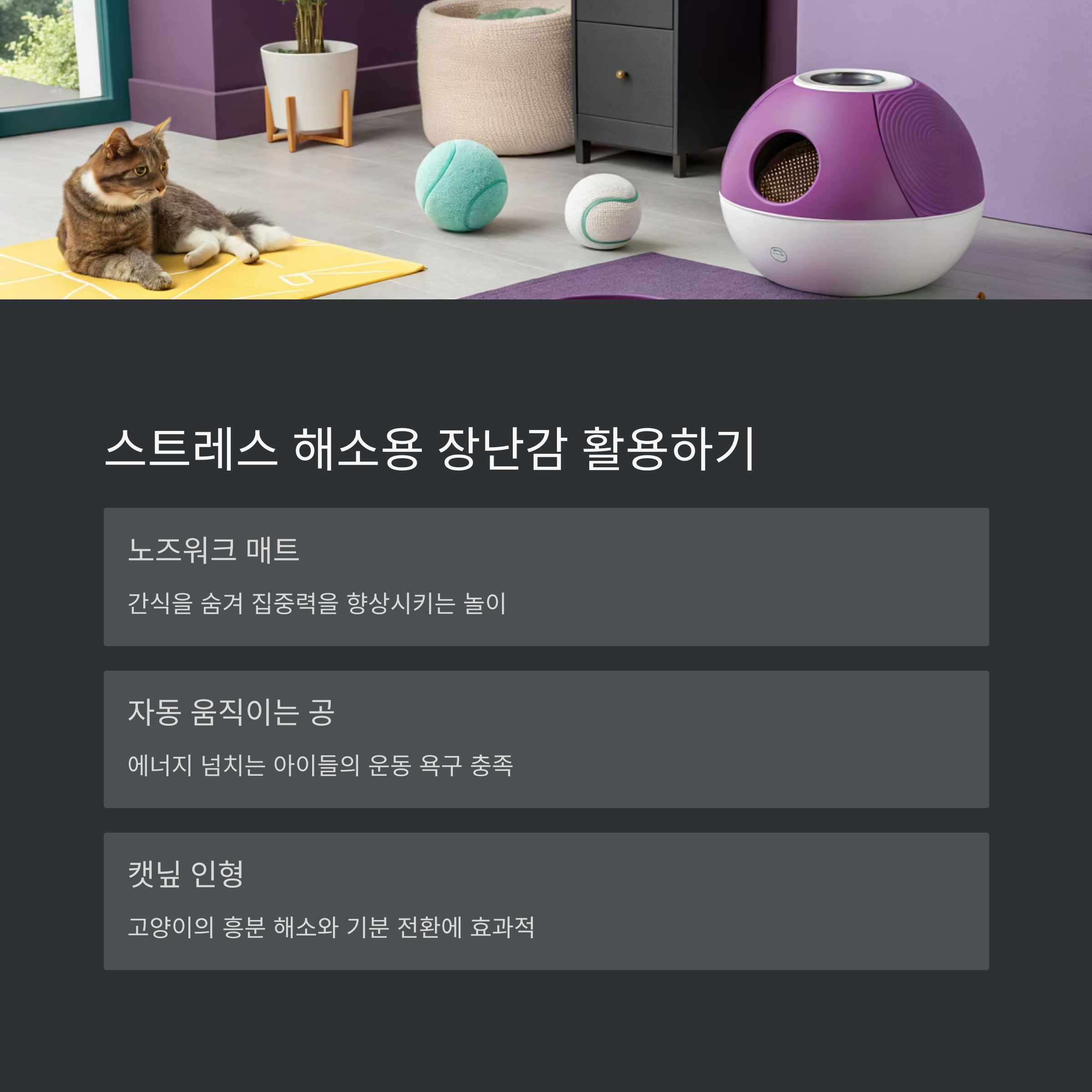 | 노즈워크 매트 | 간식 숨기기로 집중력 향상 | 강아지, 고양이 모두 |