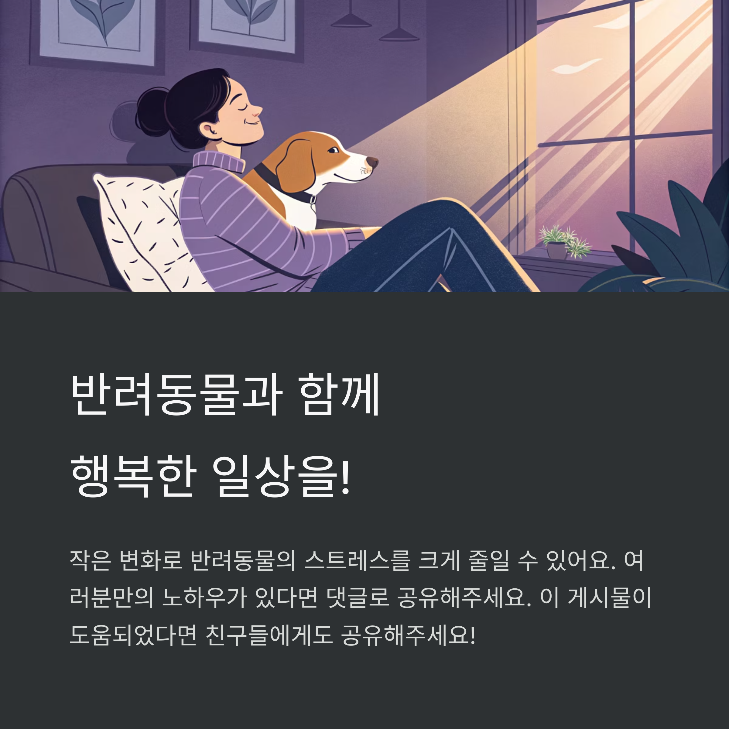 오늘 소개한 방법들이 조금이나마 도움이 되셨다면 너무 기쁠 것 같아요. 반려동물의 마음을 읽고, 집에서도 충분히 스트레스를 해소할 수 있다는 점! 저도 이 과정을 통해 우리 댕댕이들과 더 가까워졌거든요. 작은 변화가 큰 행복을 가져온다는 걸 꼭 느껴보셨으면 해요. 혹시 여러분만의 노하우가 있다면 댓글로 공유해 주세요. 함께 배우고 나누는 공간이 되었으면 좋겠습니다 🙂