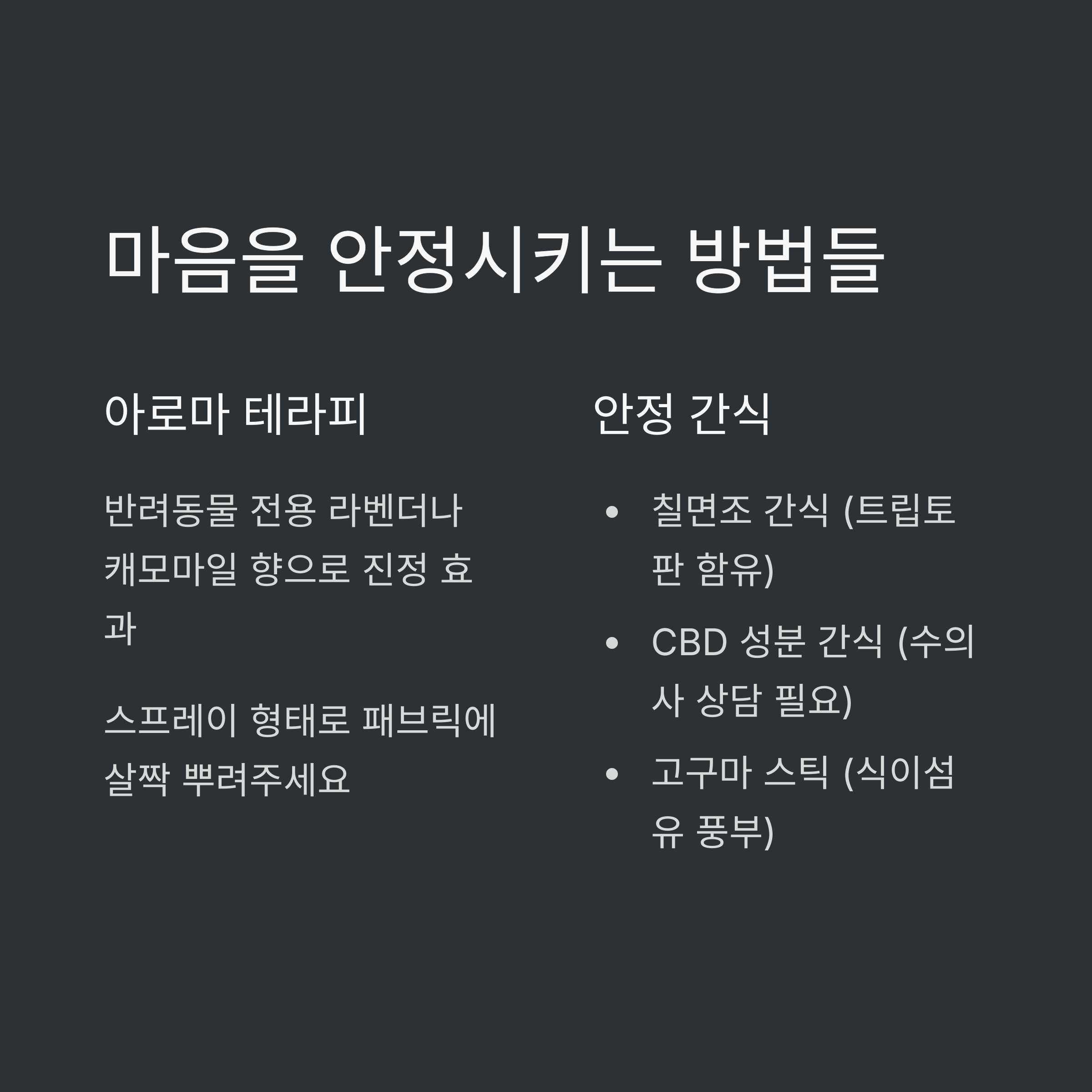 | CBD 성분 간식 | 불안 완화 및 긴장 해소 | 수의사 상담 후 사용 권장 |
