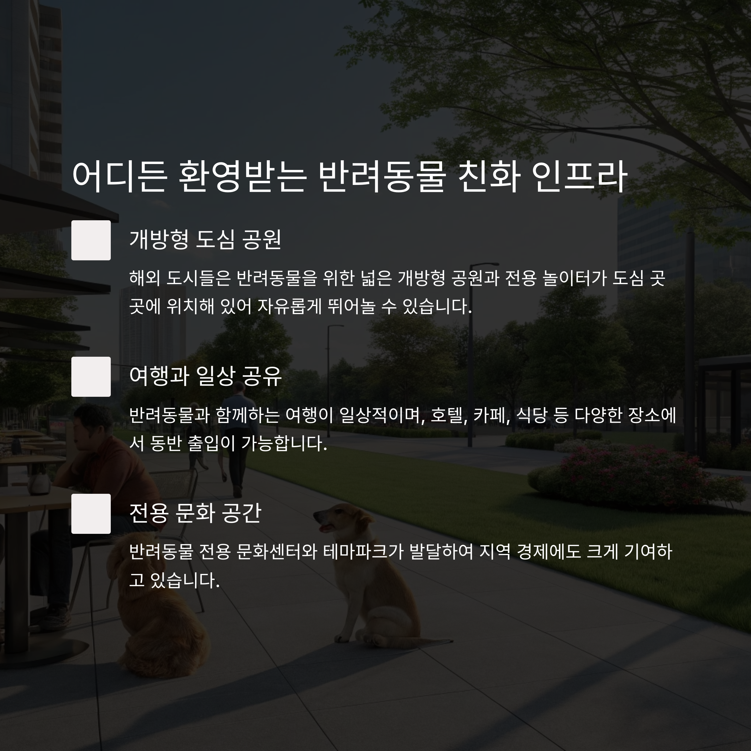 점차 변하고 있습니다. 반려동물 전용 공원, 카페, 펫택시 등 서비스가 빠르게 증가하고 있습니다.