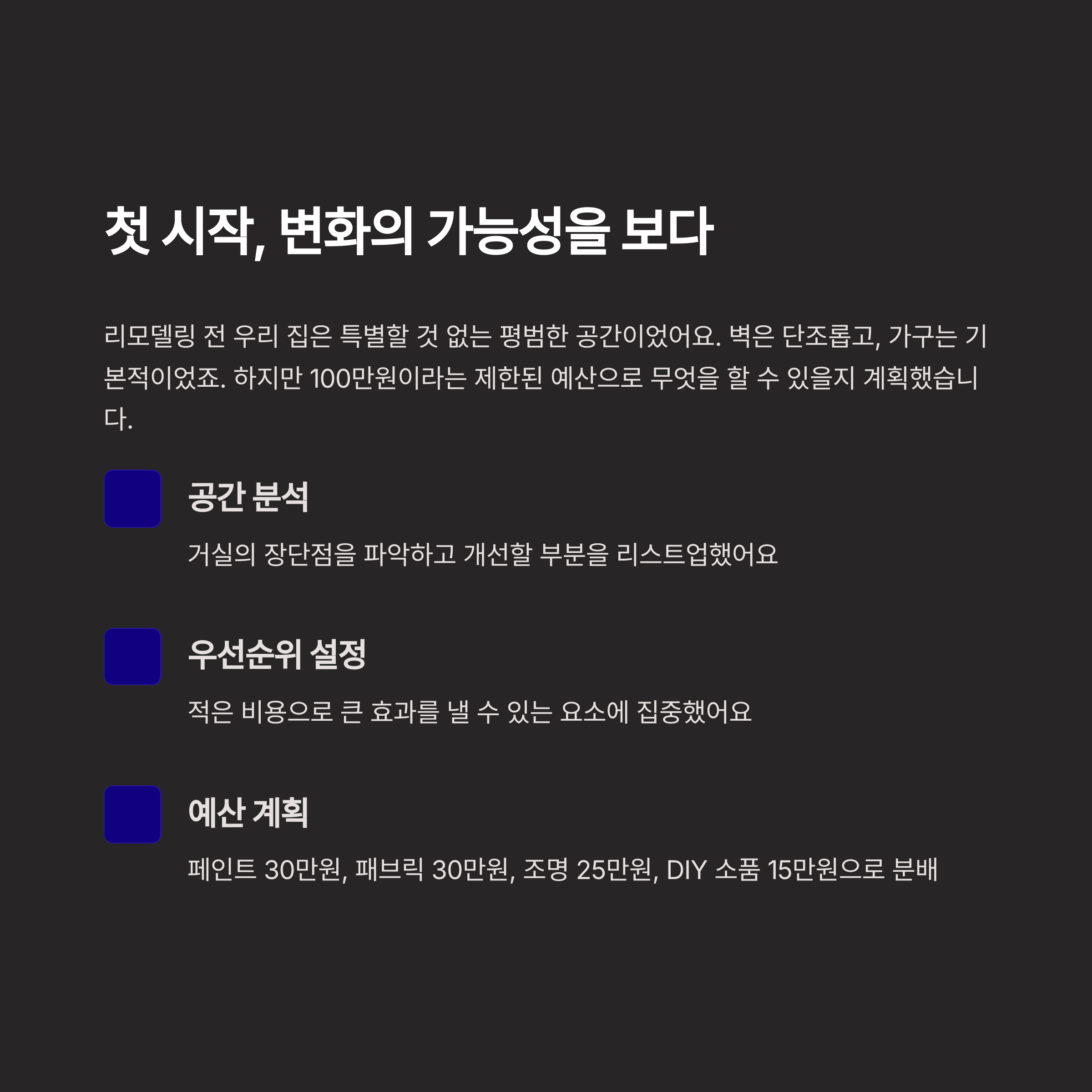 적은 예산으로도 우리 집을 확 바꿀 수 있다는 사실, 믿기시나요? 100만원으로 가능한 변화의 비밀을 알려드릴게요!