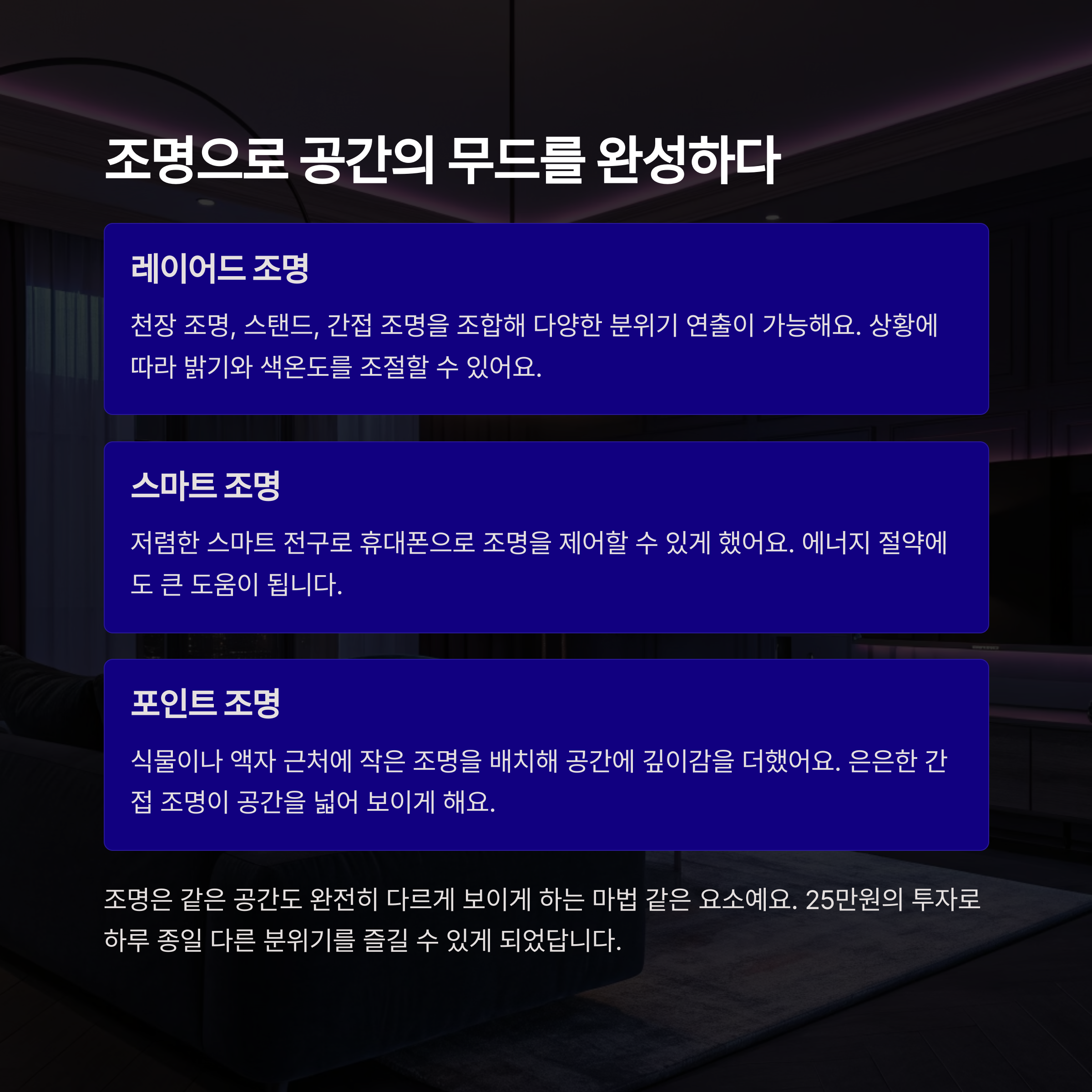 3. 전체 조명보다 간접조명이 분위기를 좌우한다.